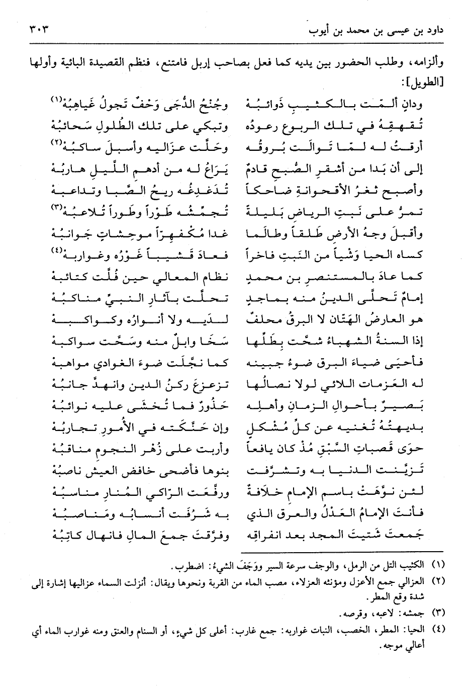وألزامه وَطلب الْحُضُور بَين يَدَيْهِ كَمَا فعل بِصَاحِب إربل فَامْتنعَ فنظم القصيدة البائية وأولها من الطَّوِيل