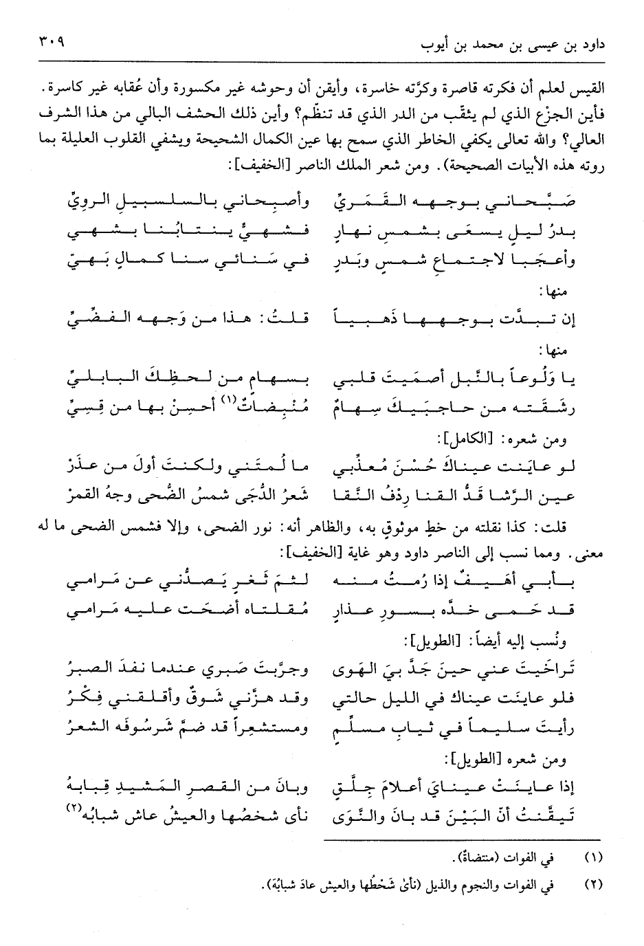 الْقَيْس لعلم أَن فكرته قَاصِرَة وكرَّته خاسرة وأيقن أَن وحوشه غير مَكْسُورَة وَأَن عِقَابه غير كاسرة فَأَيْنَ الْجزع الَّذِي لم يثقّب من الدّرّ الَّذِي قد تنظّم وَأَيْنَ ذَلِك الحشف الْبَالِي من هَذَا الشّرف العالي وَالله تَعَالَى يَكْفِي الخاطر الَّذِي سمح بهَا عين الْكَمَال الشحيحة ويشفي الْقُلُوب العليلة بِمَا روته هَذِه الأبيات الصَّحِيحَة وَمن شعر الْملك النَّاصِر من الْخَفِيف