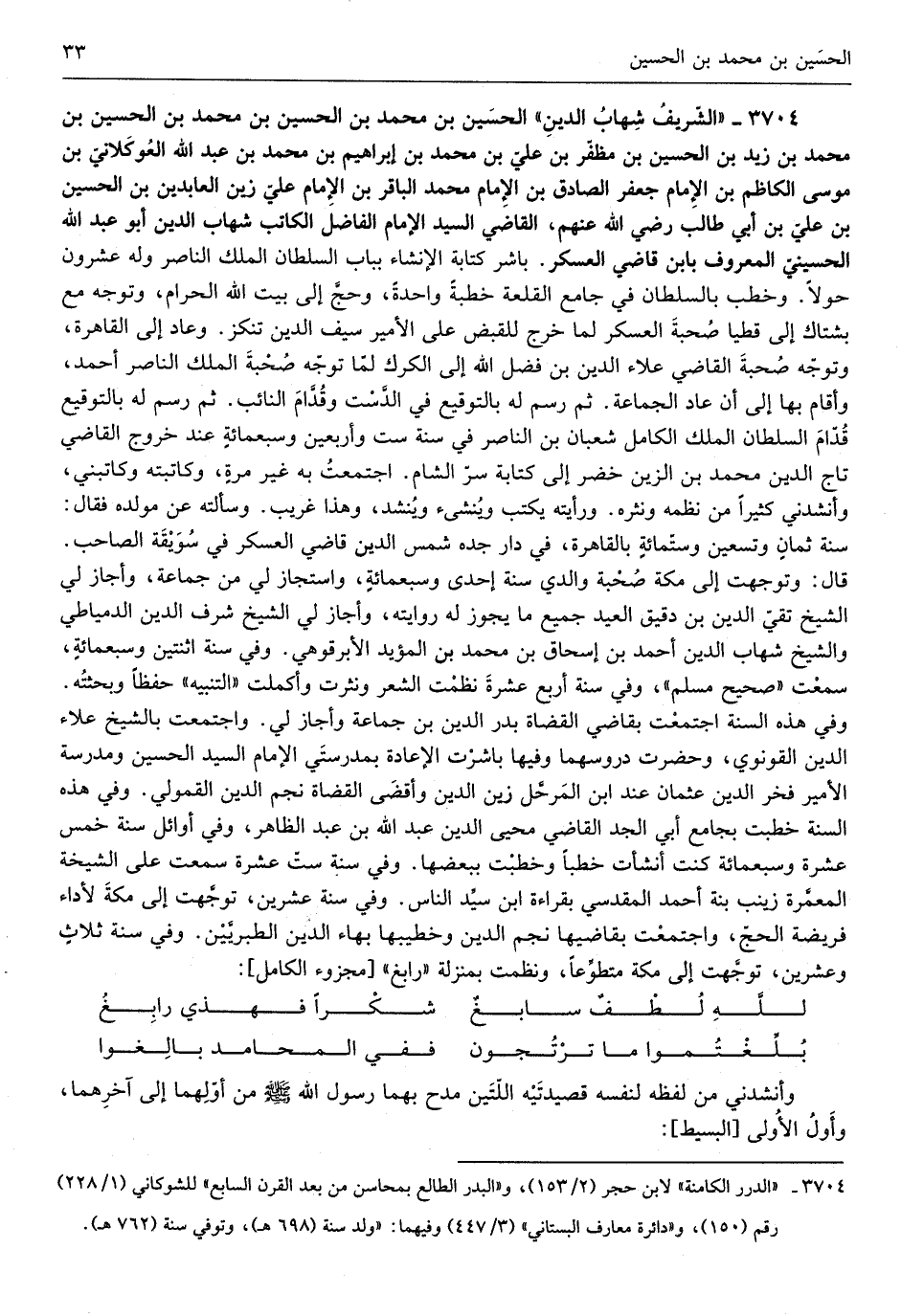 الْحُسَيْن بن مُحَمَّد بن الْحُسَيْن بن مُحَمَّد بن الْحُسَيْن بن مُحَمَّد بن زيد بن الْحُسَيْن بن مظفّر بن عَليّ بن مُحَمَّد بن إِبْرَاهِيم بن مُحَمَّد بن عبد الله العوكلانيّ ابْن مُوسَى الكاظم بن الإِمَام جَعْفَر الصَّادِق بن الإِمَام مُحَمَّد الباقر بن الإِمَام عَليّ زين العابدين بن الْحُسَيْن بن عَليّ بن أبي طَالب رَضِي الله عَنْهُم القَاضِي السَّيِّد الإِمَام الْفَاضِل الْكَاتِب شهَاب الدّين أَبُو عبد الله الْحُسَيْنِي الْمَعْرُوف بِابْن قَاضِي الْعَسْكَر بَاشر كِتَابَة الْإِنْشَاء بِبَاب السُّلْطَان الْملك النَّاصِر وَله عشرُون حولا وخطب بالسلطان فِي جَامع القلعة خطْبَة وَاحِدَة وحجَّ إِلَى بَيت الله الْحَرَام وَتوجه مَعَ بشتاك إِلَى قطيا صُحْبَة الْعَسْكَر لما خرج للقبض على الْأَمِير سيف الدّين تنكز وَعَاد إِلَى الْقَاهِرَة وتوحّه صُحْبَة القَاضِي عَلَاء الدّين بن فضل الله إِلَى الكرك لّما توجّه صُحْبَة الْملك النَّاصِر أَحْمد وَأقَام بهَا إِلَى أَن عَاد الْجَمَاعَة ثمَّ رسم لَهُ بالتوقيع فِي الدَّست وقدَّام النَّائِب ثمَّ رسم لَهُ بالتوقيع قدّام السُّلْطَان الْملك الْكَامِل شعْبَان بن النَّاصِر فِي سنة سِتّ وَأَرْبَعين وَسبع مائةٍ عِنْد خُرُوج القَاضِي تَاج الدّين مُحَمَّد بن الزين خضر إِلَى كِتَابَة سرّ الشَّام اجْتمعت بِهِ غير مرةٍ وكاتبته وكاتبني وأنشدني كثيرا من نظمه ونثره ورأيته يكْتب وينشىء وينشد وَهَذَا غَرِيب وَسَأَلته عَن مولده فَقَالَ سنة ثمانٍ وَتِسْعين وستّ مائةٍ بِالْقَاهِرَةِ فِي دَار جده شمس الدّين قَاضِي الْعَسْكَر فِي سويقة الصاحب قَالَ وتوجهت إِلَى مَكَّة صُحْبَة وَالِدي سنة)