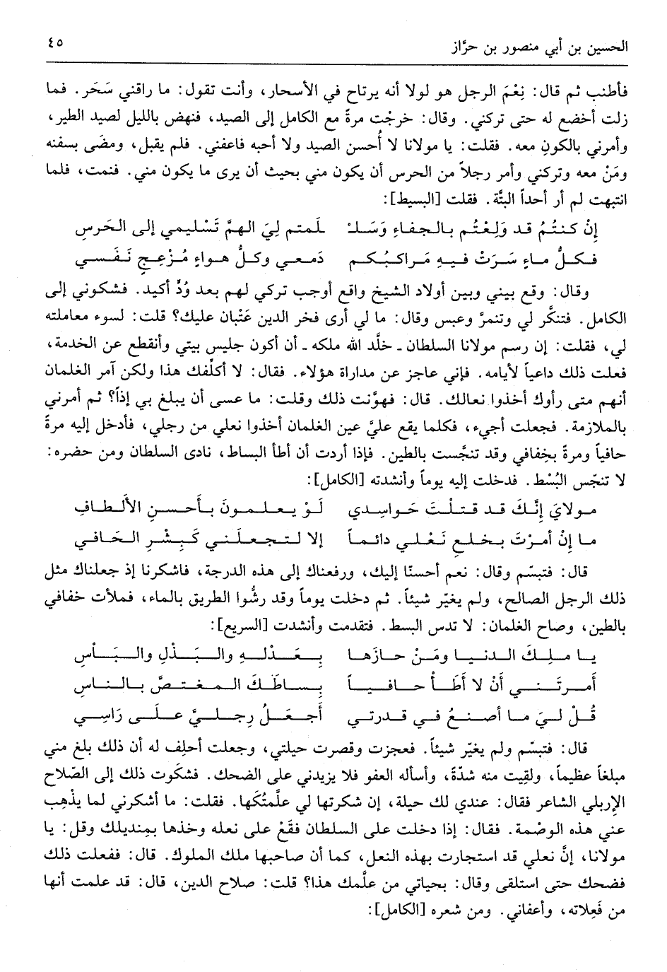 فأطنب ثمَّ قَالَ نعم الرجل هُوَ لَوْلَا أَنه يرتاح فِي الأسحار وَأَنت تَقول مَا راقني سحر فَمَا زلت أخضع لَهُ حَتَّى تركني وَقَالَ خرجت مرّة مَعَ الْكَامِل إِلَى الصَّيْد فَنَهَضَ بِاللَّيْلِ لصيد الطير وَأَمرَنِي بالكون مَعَه فَقلت يَا مَوْلَانَا لَا أحسن الصَّيْد وَلَا أحبه فاعفني فَلم يقبل وَمضى)