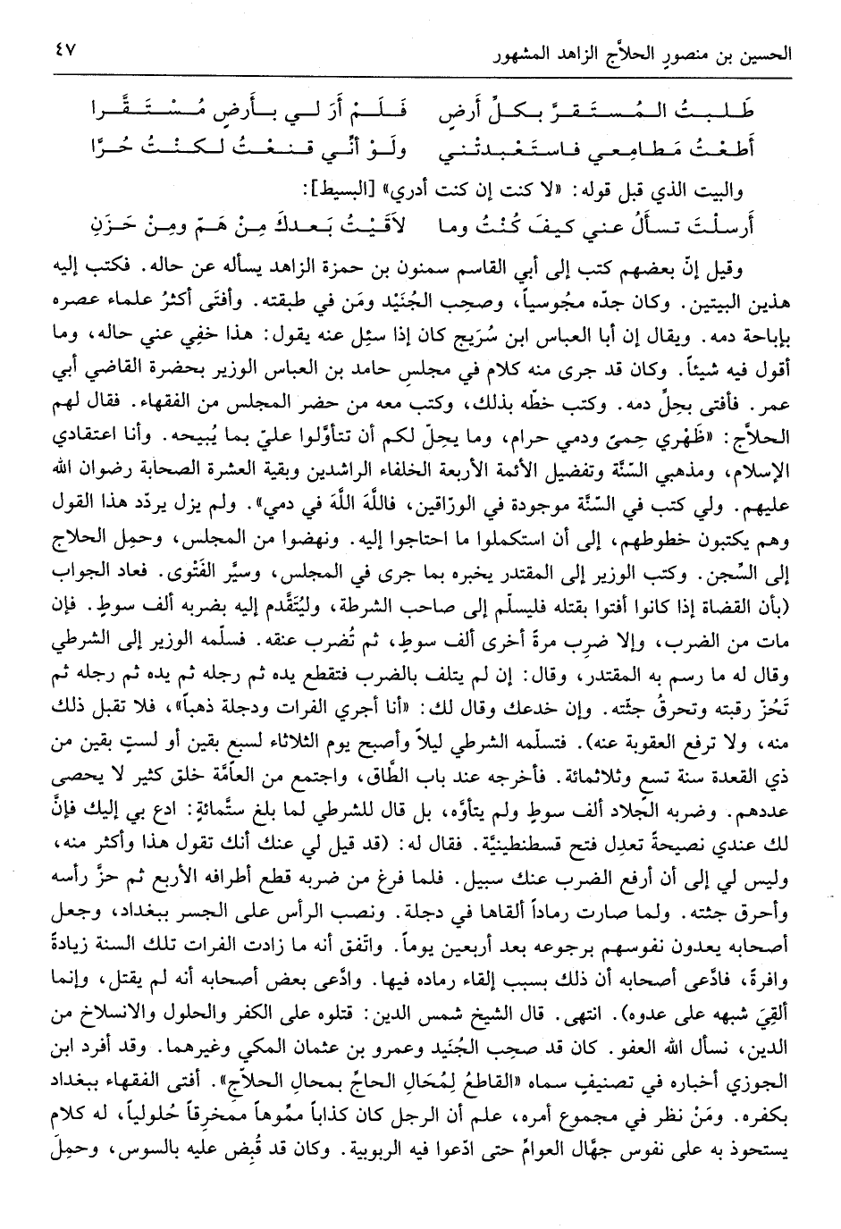 وَقيل أنّ بَعضهم كتب إِلَى أبي الْقَاسِم سمنون بن حَمْزَة الزَّاهِد يسْأَله عَن حَاله فَكتب إِلَيْهِ هذَيْن الْبَيْتَيْنِ وَكَانَ جدّه مجوسياً وَصَحب الْجُنَيْد وَمن فِي طبقته وَأفْتى أَكثر عُلَمَاء عصره بِإِبَاحَة دَمه وَيُقَال أَن أَبَا الْعَبَّاس ابْن سُرَيج كَانَ إِذا سُئِلَ عَنهُ يَقُول هَذَا رجل خَفِي عني حَاله وَمَا أَقُول فِيهِ شَيْئا وَكَانَ قد جرى مِنْهُ كَلَام فِي مجْلِس حَامِد بن الْعَبَّاس الْوَزير بِحَضْرَة القَاضِي أبي عمر فَأفْتى بحلِّ دَمه وَكتب خطّه بذلك وَكتب مَعَه من حضر الْمجْلس من الْفُقَهَاء فَقَالَ لَهُم الحلاَّج ظَهْري حمى وَدمِي حرَام وَمَا يحلّ لكم أَن تتأوَّلوا عليّ بِمَا يبيحه وَأَنا اعتقادي الْإِسْلَام ومذهبي السُّنَّة وتفضيل الْأَئِمَّة الْأَرْبَعَة الْخُلَفَاء الرَّاشِدين وَبَقِيَّة الْعشْرَة الصَّحَابَة رضوَان الله عَلَيْهِم ولي كتب فِي السّنَّة مَوْجُودَة فِي الورّاقين فَالله الله فِي دمي وَلم يزل يردِّد هَذَا القَوْل وهم يَكْتُبُونَ خطوطهم إِلَى أَن استكملوا مَا احتاجوا إِلَيْهِ ونهضوا من الْمجْلس وَحمل الحلاج إِلَى السِّجن وَكتب الْوَزير إِلَى المقتدر يُخبرهُ بِمَا جرى فِي الْمجْلس وسيَّر الْفَتْوَى فَعَاد الْجَواب بِأَن الْقُضَاة إِذا كَانُوا أفتوا بقتْله فليسلّم إِلَى صَاحب الشرطة وليتقَّدم إِلَيْهِ بضربه ألف سوطٍ فَإِن مَاتَ من الضَّرْب وَإِلَّا ضرب مرّة أُخْرَى ألف سوطٍ ثمَّ تضرب عُنُقه فسلّمه الْوَزير إِلَى الشرطي وَقَالَ لَهُ مَا رسم بِهِ المقتدر وَقَالَ إِن لم يتْلف بِالضَّرْبِ فتقطع يَده ثمَّ رجله ثمَّ يَده ثمَّ رجله ثمَّ تحزّ رقبته وَتحرق جثته وَإِن خدعك وَقَالَ لَك أَنا أجري الْفُرَات ودجلة ذَهَبا فَلَا تقبل ذَلِك مِنْهُ وَلَا ترفع الْعقُوبَة عَنهُ فتسلّمه الشرطي لَيْلًا وَأصْبح يَوْم الثُّلَاثَاء لسبعٍ بَقينَ أَو لستٍ بَقينَ من ذِي الْقعدَة سنة تسعٍ وَثَلَاث مائَة فَأخْرجهُ عِنْد بَاب الطَّاق وَاجْتمعَ من العامَّة خلق كثير لَا يُحْصى عَددهمْ وضربه الجلاد ألف سوطٍ وَلم يتأوَّه بل قَالَ الشرطي لما بلغ ستَّ مائةٍ ادْع بِي إِلَيْك فإنَّ لَك عِنْدِي نصيحةً تعدل فتح قسطنطينَّية فَقَالَ لَهُ قد قيل لي عَنْك أَن تَقول هَذَا وَأكْثر مِنْهُ وَلَيْسَ لي إِلَى أَن أَربع الضَّرْب عَنْك سَبِيل فَلَمَّا فرغ من ضربه قطع أَطْرَافه الْأَرْبَع ثمَّ حزَّ رَأسه وأحرق جثته وَلما صَارَت رَمَادا أَلْقَاهَا فِي دجلة وَنصب الرَّأْس على الجسر بِبَغْدَاد وَجعل أَصْحَابه يعدون نُفُوسهم بِرُجُوعِهِ بعد أَرْبَعِينَ يَوْمًا واتّفق أَنه مَا زَادَت الْفُرَات تِلْكَ السّنة زِيَادَة وافرةً فادَّعى أَصْحَابه أَن ذَلِك بِسَبَب إِلْقَاء رماده فِيهَا وادَّعى بعض أَصْحَابه أَنه لم يقتل وَإِنَّمَا ألقِي شبهه على)