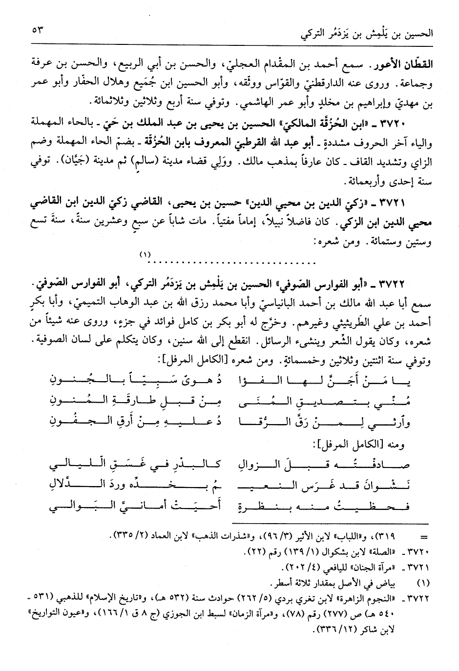 الْحُسَيْن بن يلمش بن يزدمر التركي أَبُو الفوارس الصّوفيّ سمع أَبَا عبد الله مَالك بن أَحْمد البانياسيّ وَأَبا مُحَمَّد رزق الله بن عبد الْوَهَّاب التَّمِيمِي وَأَبا بكرٍ أَحْمد بن عَليّ الطريثيثي وَغَيرهم وخرَّج لَهُ أَبُو بكر بن كَامِل فَوَائِد فِي جزءٍ وروى عَنهُ شَيْئا من شعره وَكَانَ يَقُول الشِّعر وينشئْ الرسائل انْقَطع إِلَى الله سِنِين وَكَانَ يتَكَلَّم على لِسَان الصُّوفِيَّة وَتُوفِّي سنة اثْنَتَيْنِ وَثَلَاثِينَ وَخمْس مائةٍ وَمن شعره من الْكَامِل المرفل يَا من أجن لَهَا الْفُؤَاد هوى سبيّاً بالجنون