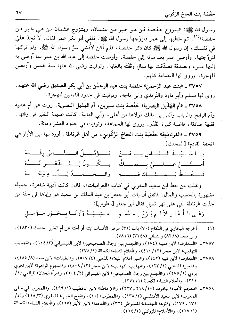 حَفْصَة بنت عبد الرَّحْمَن بن أبي بكر الصّديق رَضِي الله عَنْهُم روى لَهَا مُسلم وَأَبُو دَاوُد والتِّرمذي وَابْن ماجة وَتوفيت فِي حُدُود الثَّمَانِينَ لِلْهِجْرَةِ