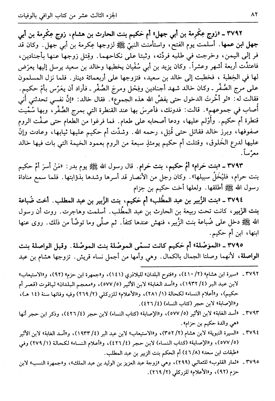 أم حَكِيم بنت الْحَارِث بن هِشَام زوج عِكْرِمَة بن أبي جهل ابْن عَمها أسلمت يَوْم الْفَتْح واستأمنت النَّبِي صلى الله عَلَيْهِ وَسلم لزَوجهَا عِكْرِمَة بن أبي جهل وَكَانَ قد فر إِلَى الْيمن وَخرجت فِي طلبه فردَّته وثبتا على نِكَاحهمَا وَقتل زَوجهَا عَنْهَا بأجنادين فاعتدَّت اربعة أشهر وَعشرا وَكَانَ يزِيد بن أبي سُفْيَان يخطبها وخَالِد بن سعيد يُرْسل إِلَيْهَا يعرّض لَهَا فِي الْخطْبَة فَخطبت إِلَى خَالِد بن سعيد فَتَزَوجهَا على أَربع مائَة دِينَار فَلَمَّا نزل الْمُسلمُونَ على مرج الصُّفَّر وَكَانَ خَالِد شهد أجنادين وفحل ومرج الصُّفَّر فَأَرَادَ أَن يعرِّس بأمّ حَكِيم فَقَالَت لَهُ لَو أخّرت الدُّخُول حَتَّى يفضَّ الله هَذِه الجموع فَقَالَ خَالِد إنَّ نَفسِي تُحَدِّثنِي أَنِّي أصَاب فِي جموعهم قَالَت فدونك فأعرس بهَا عِنْد القنطرة الَّتِي بمرج الصُّفَّر وَبهَا سمِّيت قنطرة أم حَكِيم وَأَوْلَمَ عَلَيْهَا ودعا أَصْحَابه على طَعَام فَمَا فرغوا من الطَّعَام حَتَّى صفَّت الرّوم صفوفها وبرز خَالِد فقاتل حَتَّى قتل رَحمَه الله وشدَّت أم حَكِيم عَلَيْهَا ثِيَابهَا وعات وإنّ عَلَيْهَا لدرع الخلوق وَقتلت أم حَكِيم يومئذٍ سَبْعَة من الرّوم بعمود الْخَيْمَة الَّتِي بَات فِيهَا خَالِد معرٍّساً)