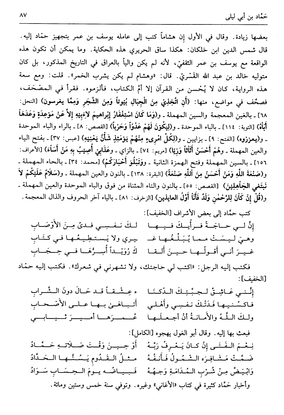 بَعْضهَا زِيَادَة وَقَالَ فِي الأول أَن هشاماً كتب إِلَى عَامله يُوسُف بن عمر بتجهيز حمّاد إِلَيْهِ قَالَ شمس الدّين ابْن خلكان هَكَذَا سَاق الحريري هَذِه الْحِكَايَة وَمَا يُمكن أَن تكون هَذِه الْوَاقِعَة مَعَ يُوسُف بن عمر الثقفيّ لِأَنَّهُ لم يكن والياً بالعراق فِي التَّارِيخ الْمَذْكُور بل كَانَ توليه خَالِد بن عبد الله القسريّ قَالَ وَهِشَام لم يكن يشرب الْخمر قلت وَمَعَ سَعَة هَذِه الرِّوَايَة كَانَ لَا يحسن من الْقُرْآن إِلَّا أمَّ الْكتاب فألزموه فَقَرَأَ فِي الْمُصحف فصحَّف فِي مَوَاضِع مِنْهَا أَن اتَّخذي من الْجبَال بُيُوتًا وَمن الشَّجر وممَّا يغرسون بالغين الْمُعْجَمَة وَالسِّين الْمُهْملَة وَمَا كَانَ اسْتِغْفَار إِبْرَاهِيم لِأَبِيهِ إلاَّ عَن موعدةٍ وعدها أَبَاهُ بِالْبَاء الْمُوَحدَة وليكون لَهُم عدوّاً وحربا بالراء وَالْبَاء الْمُوَحدَة ويعزِّزوه بزايين ولكلِّ امرىءٍ مِنْهُم يومئذٍ شأنٌ يعنيه بِفَتْح الْيَاء وَالْعين الْمُهْملَة وهم أحسن أثاثاً وزيّا بالزاي وعذابي أُصِيب بِهِ من أَسَاءَ بِالسِّين الْمُهْملَة وَفتح الْهمزَة الثَّانِيَة ونبلو أحباركم بِالْحَاء الْمُهْملَة وصنعة الله وَمن أحسن من الله صَنْعَة بالنُّون وَالْعين الْمُهْملَة وسلامٌ عَلَيْكُم لَا نتبع الْجَاهِلين بالنُّون وَالتَّاء الْمُثَنَّاة من فَوق وَالْبَاء وَالْمُوَحَّدَة وَالْعين الْمُهْملَة وَقل إِن كَانَ للرَّحمن ولدٌ فَأَنا أوَّل العايذين بِالْيَاءِ آخر الْحُرُوف والذال الْمُعْجَمَة