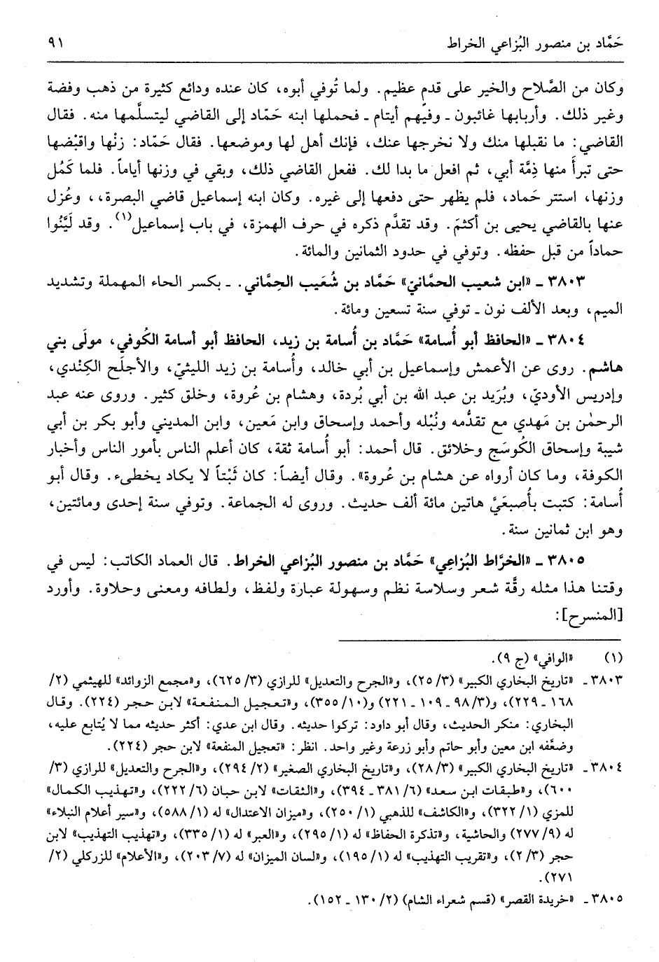 حمَّاد بن اسامة بن زيد الْحَافِظ أَبُو أُسَامَة الْكُوفِي مولى بني هَاشم روى عَن الْأَعْمَش وَإِسْمَاعِيل بن أبي خَالِد وَأُسَامَة بن زيد الليثيّ وَالْأَجْلَح الْكِنْدِيّ وَإِدْرِيس الأوديّ وبريد بن عبد الله بن أبي بردة وَهِشَام بن عُرْوَة وَخلق كثير وروى عَنهُ عبد الرَّحْمَن بن مهْدي مَعَ تقدمُّه ونبله وَأحمد وَإِسْحَق وَابْن معِين وَابْن الْمَدِينِيّ وَأَبُو بكر بن أبي شيبَة وَإِسْحَق الكوسج وخلائق قَالَ أَحْمد أَبُو أُسَامَة ثِقَة كَانَ أعلم النَّاس بِأُمُور النَّاس وأخبار الْكُوفَة وَمَا كَانَ أرواه عَن هِشَام بن عُرْوَة وَقَالَ أَيْضا كَانَ ثبتاً لَا يكَاد يخطىء وَقَالَ أَبُو أُسَامَة كتبت بأصبعيَّ هَاتين مائَة ألف حَدِيث وروى لَهُ الْجَمَاعَة وَتُوفِّي سنة إِحْدَى وَمِائَتَيْنِ وَهُوَ ابْن ثَمَانِينَ سنة