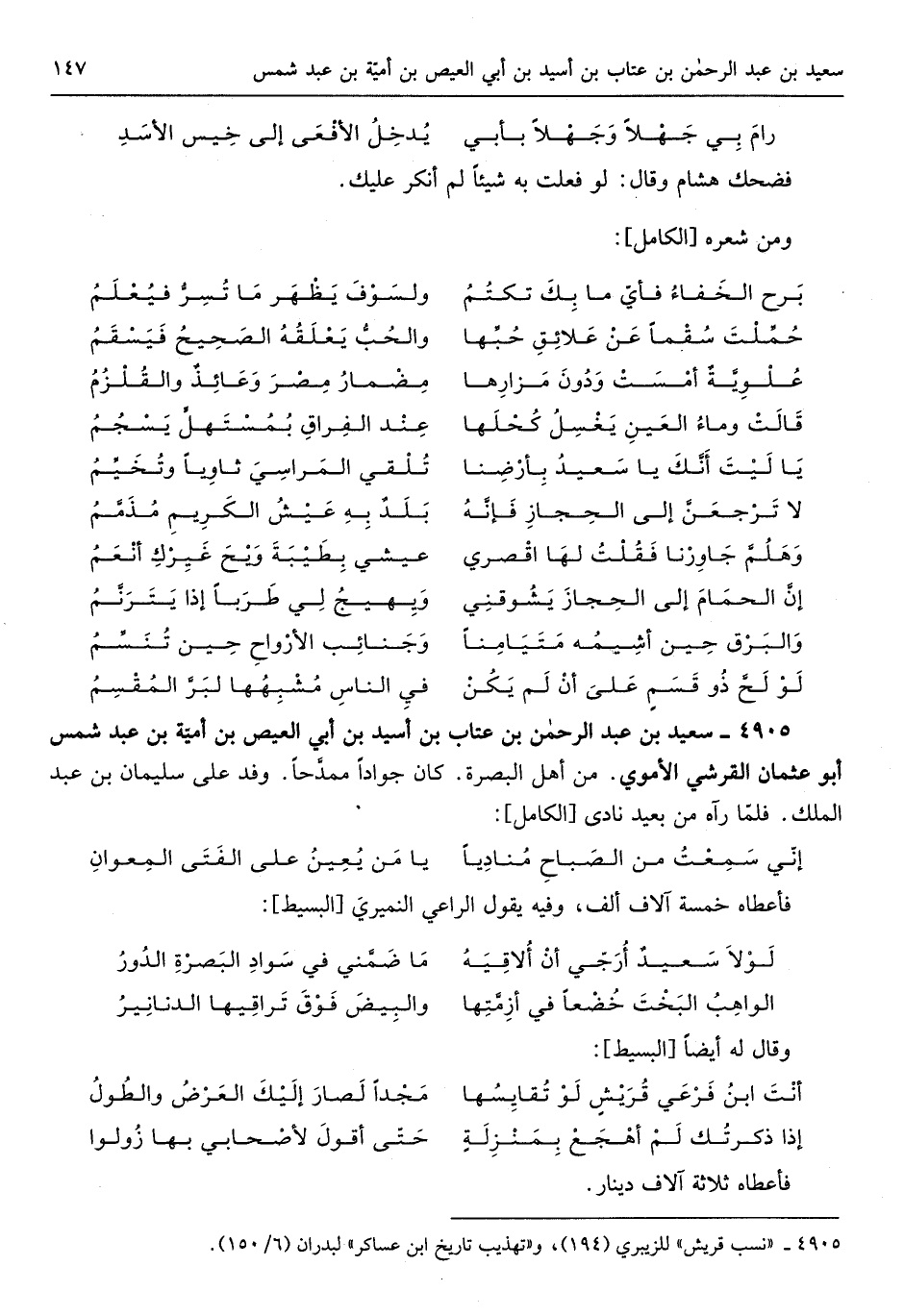 سعيد بن عبد الرَّحْمَن بن عتاب بن أسيد بن أبي الْعيص بن أُميَّة بن عبد شمس أَبُو عُثْمَان الْقرشِي الْأمَوِي من أهل الْبَصْرَة كَانَ جواداً ممدَّحاً وَفد عَلَى سُلَيْمَان بن عبد الْملك فلمّا رَآهُ من بعيد نَادَى من الْكَامِل