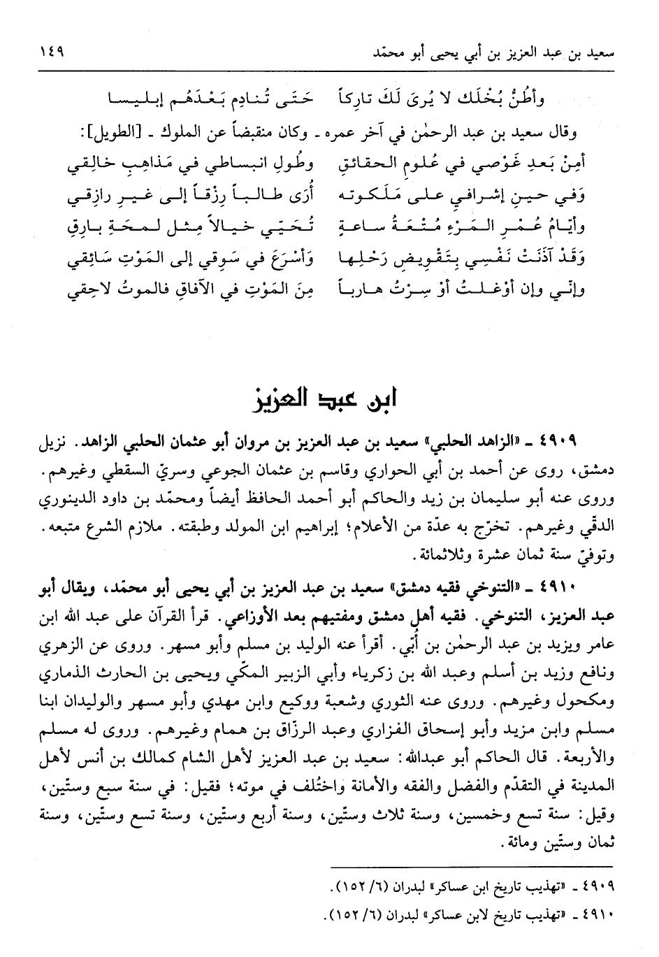 سعيد بن عبد الْعَزِيز بن أبي يحيى أَبُو محمّد وَيُقَال أَبُو عبد الْعَزِيز التنوخي فَقِيه أهل دمشق ومفتيهم بعد الْأَوْزَاعِيّ قَرَأَ الْقُرْآن عَلَى عبد الله بن عَامر وَيزِيد بن عبد الرَّحْمَن بن أُبّي أَقرَأ عَنهُ الْوَلِيد بن مُسلم وَأَبُو مسْهر وروى عَن الزُّهْرِيّ وَنَافِع وَزيد بن أسلم وَعبد الله بن أبي زَكَرِيَّاء وَأبي الزبير المكّي وَيحيى بن الْحَارِث الذمارِي وَمَكْحُول وَغَيرهم وروى عَنهُ الثَّوْريّ وَشعْبَة ووكيع وَابْن مهْدي وَأَبُو مسْهر والوليدان ابْن مُسلم وَابْن مزِيد وَأَبُو إِسْحَاق الْفَزارِيّ وَعبد الرزّاق بن همام وَغَيرهم وروى لَهُ مُسلم وَالْأَرْبَعَة قَالَ الْحَاكِم أَبُو عبد الله سعيد بن عبد الْعَزِيز لأهل الشَّام كَمَا لَكَ بن أنس لأهل الْمَدِينَة فِي التقدّم وَالْفضل وَالْفِقْه)