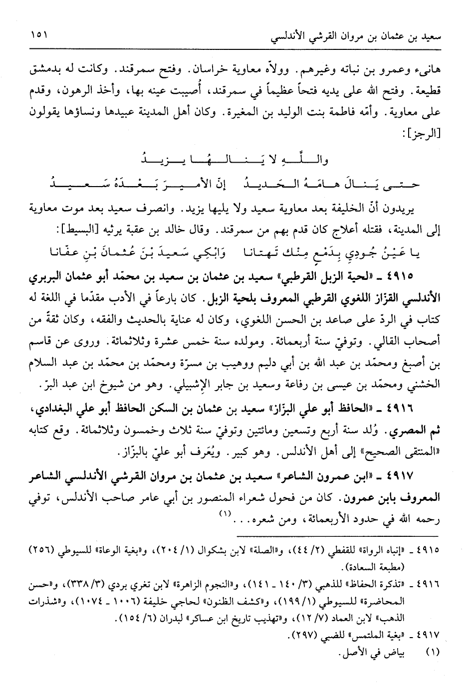 سعيد بن عُثْمَان بن مَرْوَان الْقرشِي الأندلسي الشَّاعِر الْمَعْرُوف بِابْن عمرون كَانَ من فحول شعراء الْمَنْصُور بن أبي عَامر صَاحب الأندلس توفيّ رَحمَه الله فِي حُدُود الْأَرْبَع مائَة وَمن)