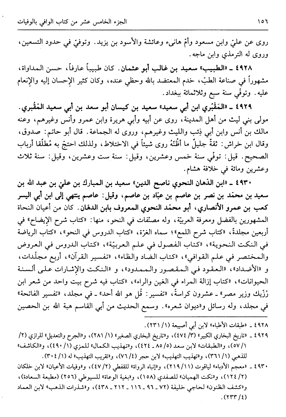 سعيد بن كيسَان أَبُو سعيد بن أبي سعيد المقْبُري مولى بني لَيْث من أهل الْمَدِينَة روى عَن أَبِيه وَأبي هُرَيْرَة وَابْن عَمْرو وَأنس وَغَيرهم وَعنهُ مَالك بن أنس وَابْن أبي ذِئب وَاللَّيْث وَغَيرهم روى لَهُ الْجَمَاعَة قَالَ أَبُو حَاتِم صدروق وَقَالَ ابْن خرَاش ثقةٌ خليلٌ أثبتُ النَّاس فِيهِ اللَّيْث قَالَ ابْن سعد ثِقَة لكنّه اخْتَلَط قبل مَوته بِأَرْبَع سِنِين قَالَ الشَّيْخ شمس الدّين مَا أظُنُّهُ روى شَيْئا فِي الِاخْتِلَاط وَلذَلِك احتجّ بِهِ مُطلقاً أَرْبَاب الصَّحِيح قيل توفيّ سنة خمس وَعشْرين وَقيل سنة سِتّ وَعشْرين وَقيل سنة ثَلَاث وَعشْرين وَمِائَة فِي خلَافَة هِشَام