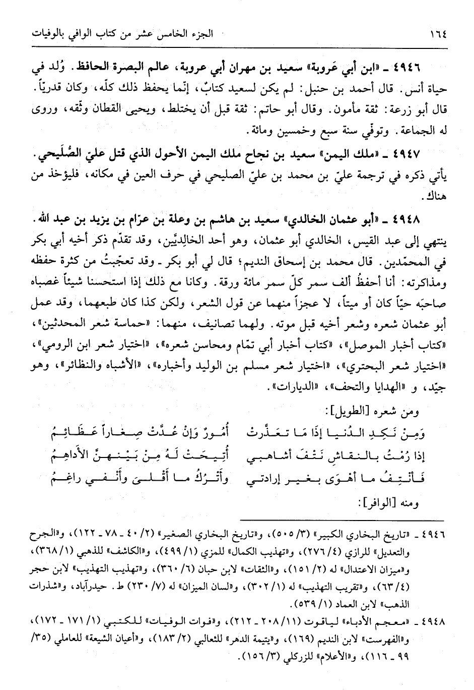 سعيد بن هَاشم بن وَعلة بن عرّام بن يزِيد بن عبد الله يَنْتَهِي إِلَى عبد الْقَيْس الخالدي أَبُو عُثْمَان وَهُوَ أحد الخالديّين وَقَدْ تقدّم ذكر أَخِيه أبي بكر فِي المحمّدين قَالَ مُحَمَّد ابْن إِسْحَاق النديم قَالَ لي أَبُو بكر وَقَدْ تعجّبتُ من كَثْرَة حفظه ومذكراته أَنا أحفظُ ألف سمر كلّ سمر مائَة ورقة وَكَانَا مَعَ ذَلِكَ إِذا استحسنا شَيْئا غصباه صاحبَه حَيا كَانَ أَو مَيتا لَا عَجزا مِنْهُمَا عَن قَول الشّعْر وَلَكِن كَذَا كَانَ طبعهما وَقَدْ عمل أَبُو عُثْمَان شعره وَشعر أَخِيه قبل مَوته