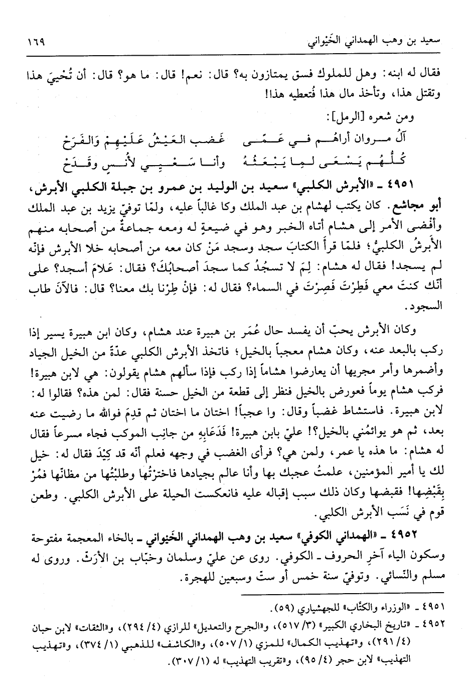 سعيد بن الْوَلِيد بن عَمْرو بن جبلة الْكَلْبِيّ الأبرش أَبُو مجاشع كَانَ يكْتب لهشام بن عبد الْملك وَكَانَ غَالِبا عَلَيْهِ ولمّا توفيّ يزِيد بن عبد الْملك وأفضى الْأَمر إِلَى هِشَام أَتَاهُ الْخَبَر وَهُوَ فِي ضيعةٍ لَهُ وَمَعَهُ جماعةٌ من أَصْحَابه مِنْهُم الأبرشُ الكلبيُّ فلمّا قَرَأَ الْكتاب سجد وَسجد من كَانَ مَعَه من أَصْحَابه خلا الأبرش فَإِنَّهُ لَمْ يسْجد فَقَالَ لَهُ هِشَام لِمَ لَا تسجُدُ كَمَا سجدَ أصحابُكَ فَقَالَ عَلامَ أَسجد عَلَى أَنَّك كنت معي فطرت فصرتَ فِي السَّمَاء فَقَالَ لَهُ فَإِن طِرْنا بك مَعنا قَالَ والآن طَابَ السُّجُود وَكَانَ الأبرش يحبّ أَن يفْسد حَال عُمَر بن هُبَيْرَة عِنْد هِشَام وَكَانَ ابْن هُبَيْرَة يسير إِذا ركب بالبعد عَنهُ وَكَانَ هِشَام معجباً بِالْخَيْلِ فَاتخذ الأبرش الْكَلْبِيّ عدّةً من الْخَيل الْجِيَاد وأضمرها وَأمر مجريها أَن يعارضوا هشاماً إِذا ركب فَإِذا سَأَلَهُمْ هِشَام يَقُولُونَ هِيَ لِابْنِ هُبَيْرَة فَركب هِشَام يَوْمًا فعورض بِالْخَيْلِ فَنظر إِلَى قِطْعَة من الْخَيل حَسَنَة فَقَالَ لمن هَذِهِ فَقَالُوا لَهُ لِابْنِ هُبَيْرَة فاستشاط غَضبا وَقَالَ وَاعجَبا اختان مَا اختان ثُمَّ قَدِمَ فوَاللَّه مَا رضيت عَنهُ بعد ثُمَّ هم يوائمُني بِالْخَيْلِ عليّ بِابْن هُبَيْرَة فَدَعَا بِهِ من جانِب الموكب فجَاء مسرعاً فَقَالَ لَهُ هِشَام مَا هَذِهِ ياعمر وَلمن هِيَ فَرَأى الْغَضَب فِي وَجهه فَعلم أنّه قَدْ كِيْدَ فَقَالَ لَهُ خيل لَكَ يَا أَمِير الْمُؤمنِينَ علمتُ عجبك بِهَا وَأَنا عَالم بجيادها فاخترتُها وطلبتُها من مظانهّا فمُرْ بقبْضِها فقبضها وَكَانَ ذَلِكَ سَبَب إقباله عَلَيْهِ فانعكست الْحِلْية عَلَى الأبرش الْكَلْبِيّ وَطعن قوم فِي تَسَب الأبرش الْكَلْبِيّ