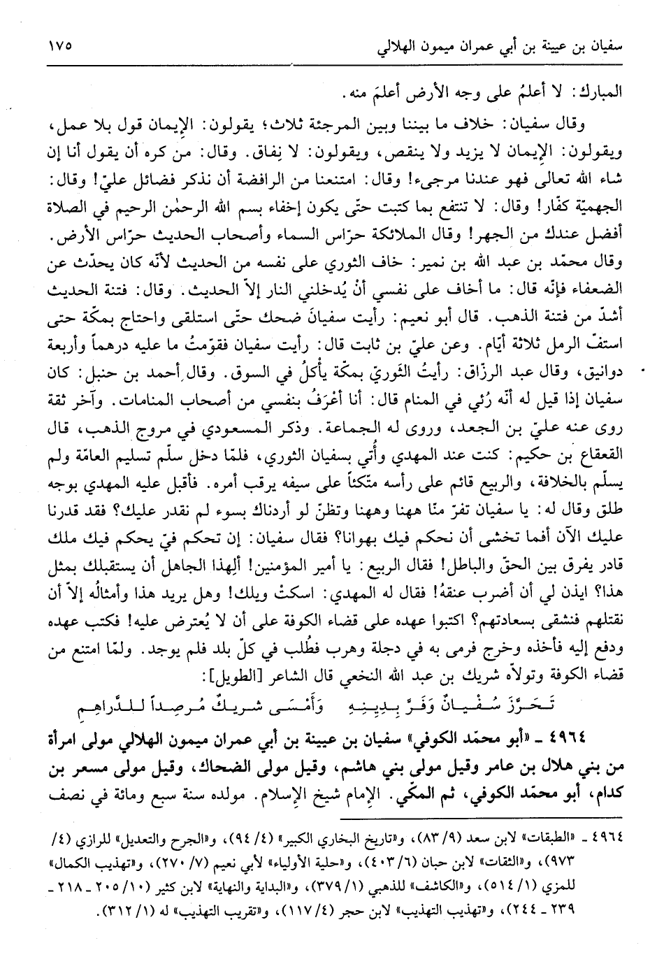 سُفْيَان بن عُيَيْنَة بن أبي عمرَان مَيْمُون الْهِلَالِي مولى امْرَأَة من بني هِلَال ابْن عَامر وَقيل مولى بني هَاشم وَقيل مولى الضَّحَّاك وَقيل مولى مسعر بن كدام لأبو محمّد الْكُوفِي ثُمَّ المكّي الإِمَام شيخ الْإِسْلَام مولده سنة سبع وَمِائَة فِي نصف