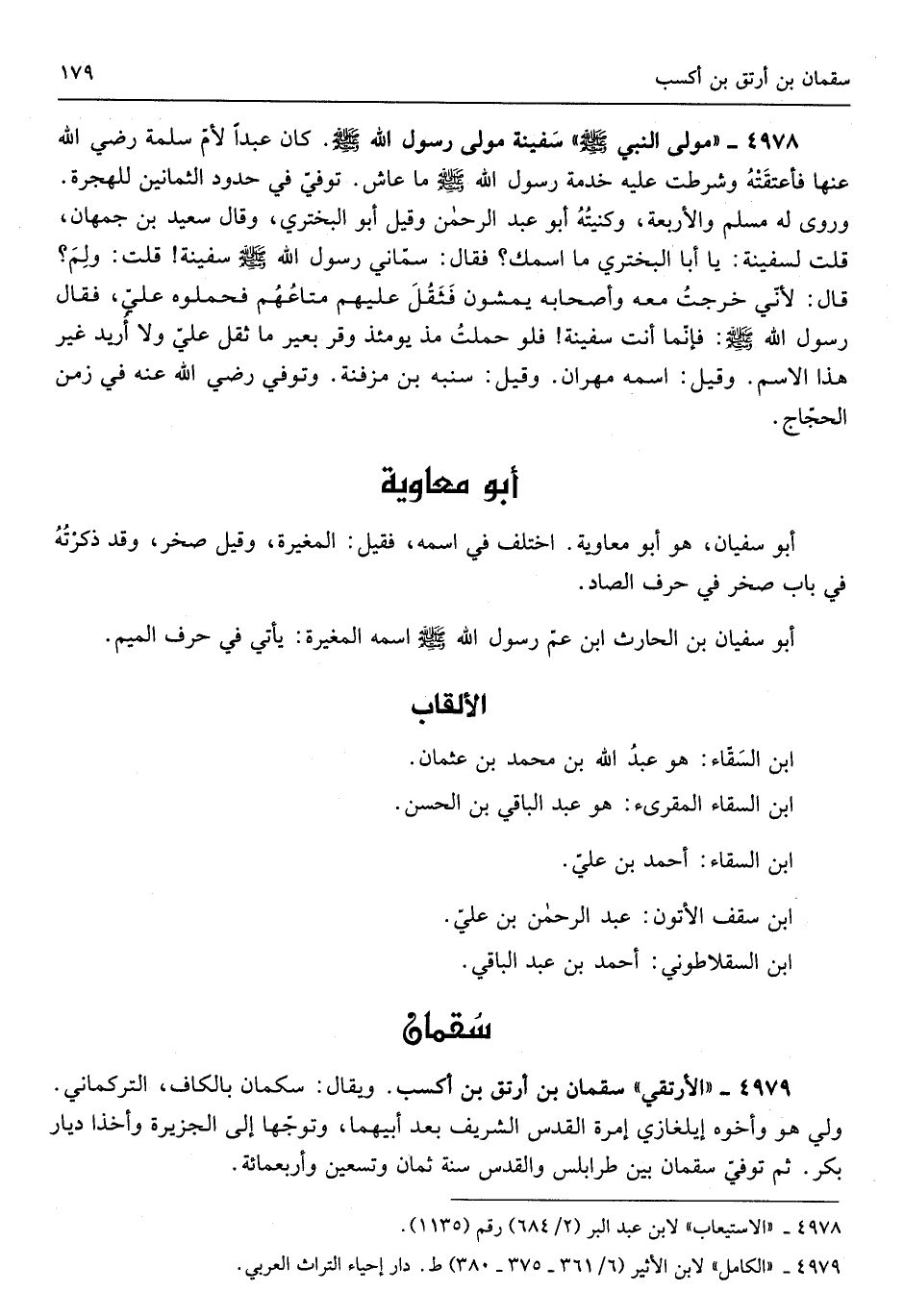 سُفْيَان مولى رَسُول الله صلى الله عَلَيْهِ وَسلم كَانَ عبدا لأمّ سَلمَة رَضِي الله عَنْهُمَا فأعتقَتْهُ وشرطت عَلَيْهِ خدمَة الرَّسُول الله صلى الله عَلَيْهِ وَسلم مَا عَاشَ توفّي فِي حُدُود الثماني لِلْهِجْرَةِ وروى لَهُ مُسلم وَالْأَرْبَعَة وكنيتُهُ أَبُو عبد الرَّحْمَن وَقيل أَبُو البخْترِي وَقَالَ سعيد ابْن جمْهَان قلت لسفينة يَا أَبَا البخْترِي مَا اسْمك فَقَالَ سماني رَسُول الله صلى الله عَلَيْهِ وَسلم سفينة قلت ولمَ قَالَ لأنّي خرجتُ مَعَه وَأَصْحَابه يَمْشُونَ فثَقُلَ عَلَيْهِم متاعُهُم فَحَمَلُوهُ عليّ فَقَالَ رَسُول الله صلى الله عَلَيْهِ وَسلم فإنمّا أَنْت سفينة فَلَو حملت مذ يَوْمئِذٍ وقر بعير مَا ثقل عليّ وَلَا أُريد غر هَذَا الِاسْم وَقيل اسْمه مهْرَان وَقيل سنبه بن موفنة توفيّ رضه فِي زمن الحجّاج