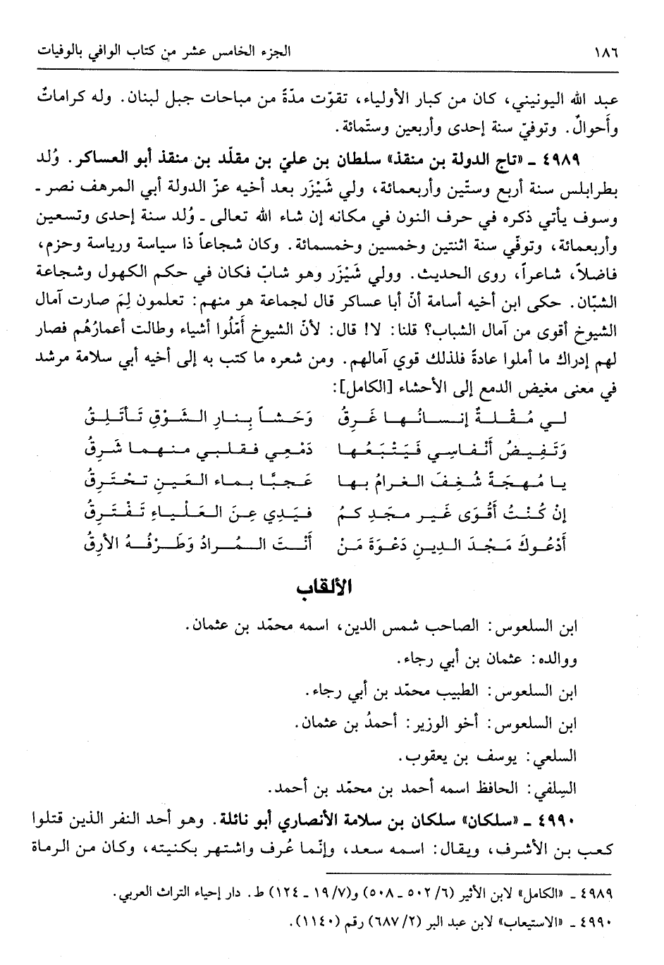سُلْطَان بن عليّ بن مقلّد بن منقذ أَبُو العساكر وُلد بطرابلس سنة أَربع وستّين وأرع مائَة ولي شَيْزَر بعد أَخِيه عزّ الدولة أبي المرهف نصر وسوف يَأْتِي ذكره فِي حرف النُّون فِي مَكَانَهُ إِن شَاءَ الله تَعَالَى وُلد سنة إِحْدَى وَتِسْعين وَأَرْبع مائَة وتوفيّ سنة اثْنَتَيْنِ وَخمسين وَخمْس مائَة وَكَانَ شجاعاً ذَا سياسة ورياسة وحزم فَاضلا شَاعِرًا روى الحَدِيث وَولي شَيْزَر وَهُوَ شابّ فَكَانَ فِي حكم الكهول وشجاعة الشبّان حكى ابْن أَخِيه أُسَامَة أنّ أَبَا عَسَاكِر قَالَ لجَماعَة هُوَ مِنْهُم تعلمُونَ لِمَ صَارَت آمال الشُّيُوخ أقوى من آمال الشَّبَاب قُلْنَا لَا قَالَ لأنّ الشُّيُوخ أمَلُوا أَشَاء وطالت أعمارُهُم فَصَارَ لَهُم إِدْرَاك مَا أملوا عَادَة فَلذَلِك قويت آمالهم وَمن شعره مَا كتب بِهِ إِلَى أَخِيه أبي سَلامَة مرشد فِي معنى مغيض الدمع إِلَى الأحشاء من الْكَامِل