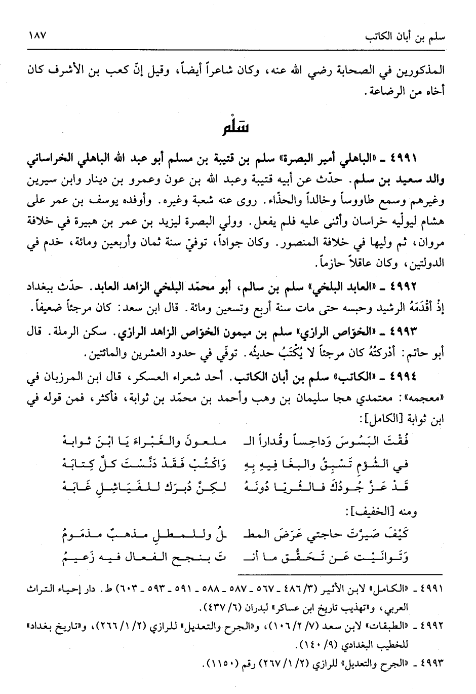 سلم بن أبان الْكَاتِب أحد شعراء الْعَسْكَر قَالَ ابْن الْمَرْزُبَان فِي مُعْجَمه معتمدي هجا سُلَيْمَان)
