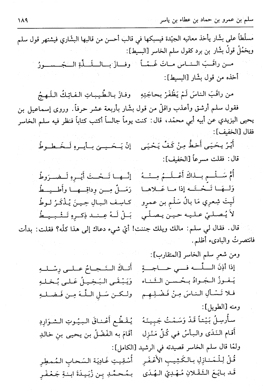 فَقَوْل سلم أرشق وأعذب واقلّ من قَول بشّار بأَرْبعَة عشر حرفا وروى إِسْمَاعِيل بن يحيى اليزيدي عَن أَبِيه أبي محمّد قَالَ كنت يَوْمًا جَالِسا أكتب كتابا فَنظر فِيهِ سلم الخاسر فَقَالَ من الْخَفِيف