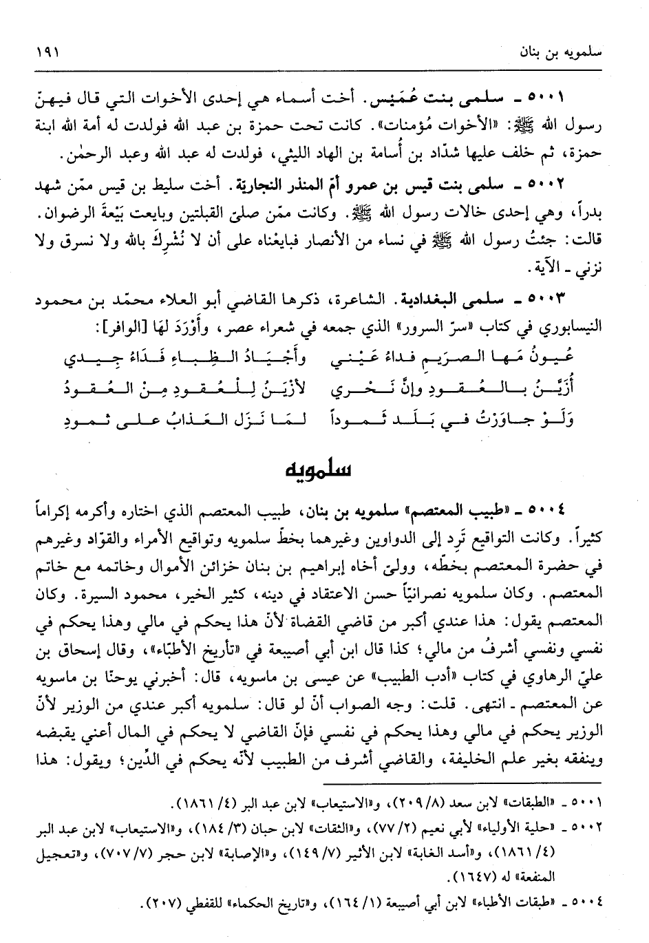 سلموية بن بنان طَبِيب المعتصم الَّذِي اخْتَارَهُ وأكرمه إِكْرَاما كثيرا وَكَانَتْ التواقيع تَرِد إِلَى الدَّوَاوِين وَغَيرهَا بخطّ سلمويه وتواقيع الْأُمَرَاء والقوّاد وَغَيرهم فِي حَضْرَة المعتصم بخطّه وولىّ أَخَاهُ إِبْرَاهِيم بن بنان خَزَائِن الْأَمْوَال وخاتمه مَعَ خَاتم المعتصم وَكَانَ سلموية نصرانيّاً حسن الِاعْتِقَاد فِي دينه كثير الْخَيْر مَحْمُود السِّيرَة وَكَانَ المعتصم يَقُول هَذَا عِنْدِي أكبر من قَاضِي الْقُضَاة لأنّ هَذَا يحكم فِي مَالِي وَهَذَا يحكم فِي نَفسِي وَنَفْسِي أشرفُ من مَالِي كَذَا قَالَ ابْن أبي أصيبعة فِي تأريخ الْأَطِبَّاء وَقَالَ إِسْحَاق بن عليّ الرهاوي فِي كتاب أدب الطَّبِيب عَن عِيسَى بن ماسويه قَالَ أَخْبرنِي يوحنّا بن ماسويه عَن المعتصم انْتهى قلت وَجه الصَّوَاب أنّ لَو قَالَ سلمويه أكبر عِنْدِي من الْوَزير لأنّ الْوَزير يحكم فِي مَالِي وَهَذَا يحكم فِي نَفسِي فإنّ القَاضِي لَا يحكم فِي المَال أَعنِي يقبضهُ وينفقه بِغَيْر علم الْخَلِيفَة وَالْقَاضِي أشرف من الطَّبِيب لأنّه يحكم فِي الدّين وَيَقُول هَذَا