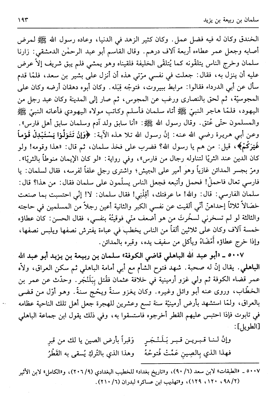 الخَنْدَق وَكَانَ لَهُ فِيهِ فضل عمل وَكَانَ كثير الزّهْد فِي الدُّنْيَا وعاده رَسُول الله صلى الله عَلَيْهِ وَسلم لمَرض أَصَابَهُ وَجعل عمر عطاءه أَرْبَعَة آلَاف دِرْهَم وَقَالَ الْقَاسِم أَبُو عبد الرَّحْمَن الدِّمَشْقِي زارنا سلمَان وَخرج النَّاس يتلقّونه كَمَا يُتلقّى الْخَلِيفَة فلقيناه وَهُوَ يمشي فَلم يبْق شرِيف إلاّ عرض عَلَيْهِ أَن ينزل بِهِ فَقَالَ جعلت فِي نَفسِي مرّتي هَذِهِ أَن أنزل عَلَى بشير بن سعد فلمّا قدم سَأَلَ عَن أبي الدَّرْدَاء فَقَالُوا مرابط ببيروت فتوجّه قِبّله وَكَانَ أَبوهُ دهقان أرضه وَكَانَ عَلَى المجوسيّة ثُمَّ لحق بالنصارى وَرغب عَن الْمَجُوس ثُمَّ صَار إِلَى الْمَدِينَة وَكَانَ عبد رجل من الْيَهُود فلمّا هَاجر النبيّ صلى الله عَلَيْهِ وَسلم أَتَاهُ سلمَان فَأسلم وَكَاتب مَوْلَاهُ الْيَهُودِيّ فأعانه النبيّ صلى الله عَلَيْهِ وَسلم والمسلمون حتّى عتق وَقَالَ رَسُول الله صلى الله عَلَيْهِ وَسلم أَنا سَابق ولد آدم وسلمان سَابق أهل فَارس وَعَن أبي هُرَيْرَة رضه إنّ رَسُول الله تَلا هَذِهِ الْآيَة وَإنْ تَتَوَلَّوا يَسْتَبْدِلْ قَوماً غَيْرَكُم قيل من هم يَا رَسُول الله فَضرب عَلَى فَخذ سلمَان ثُمَّ قَالَ هَذَا وَقَومه وَلَو كَانَ الدّين عِنْد الثريّا أتناوله رجال من فَارس وَفِي رِوَايَة لَو كَانَ الْإِيمَان مَنُوطًا بالثريّا ومرّ بجسر الْمَدَائِن غازياً وَهُوَ أَمِير عَلَى الْجَيْش وَاشْترى رجل علفاً لفرسه فَقَالَ لسلمان يَا فَارسي تعال فاحملْ فَحمل وَأتبعهُ فَجعل النَّاس)