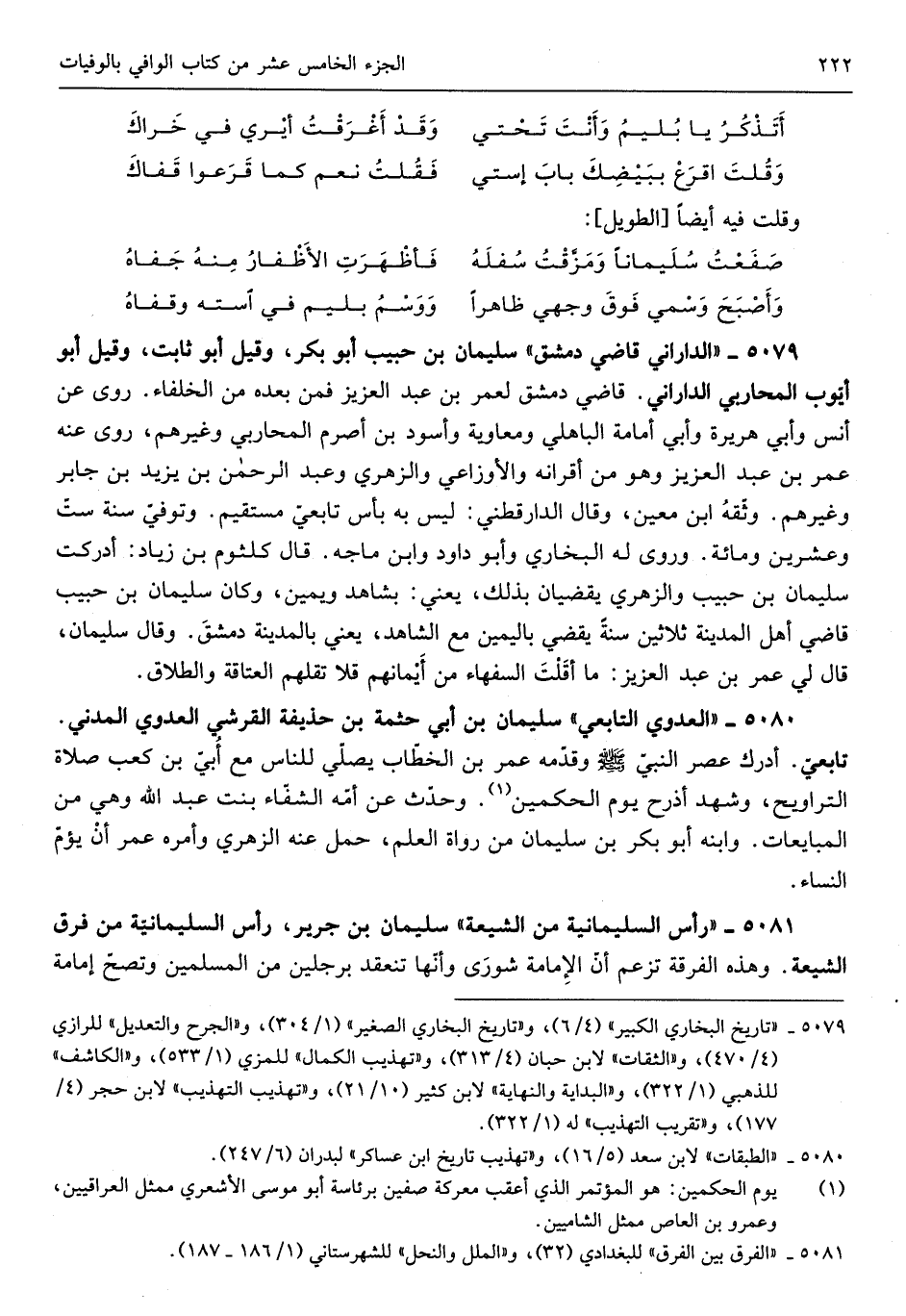 سُلَيْمَان بن حبيب أَبُو بكر وَقيل أَبُو ثَابت وَقيل أَبُو أيّوب الْمحَاربي الدَّارَانِي قَاضِي دمشق لعمر بن عبد الْعَزِيز فَمن بعده من الْخُلَفَاء روى عَن أنس وَأبي هُرَيْرَة وَأبي امامة الْبَاهِلِيّ وَمُعَاوِيَة وأسود بن أَصْرَم الْمحَاربي وَغَيرهم روى عَنهُ عمر بن عبد الْعَزِيز وَهُوَ من أقرانه وَالْأَوْزَاعِيّ وَالزهْرِيّ وَعبد الرَّحْمَن ابْن يزِيد بن جَابر وَغَيرهم وثّقهُ ابْن معِين وَقَالَ الدَّارَقُطْنِيّ لَيْسَ بِهِ بآس تابعيّ مُسْتَقِيم وتوفيّ سنة ستّ وَعشْرين وَمِائَة روى لَهُ البُخَارِيّ وَأَبُو دَاوُد وَابْن ماجة قَالَ كُلْثُوم بن زِيَاد أدْركْت سُلَيْمَان بن حبيب وَالزهْرِيّ يقضيان بذلك يَعْنِي يُشَاهد وَيَمِين وَكَانَ سُلَيْمَان بن حبيب قَاضِي أهل الْمَدِينَة ثَلَاثِينَ سنة يقْضِي بِالْيمن مَعَ الشَّاهِد يَعْنِي بالدينة دمشق وَقَالَ سُلَيْمَان قَالَ لي عمر ابْن عبد الْعَزِيز مَا أقَلْتَ السُّفَهَاء من أيْمانهم فَلَا تقلهم الْعتَاقَة وَالطَّلَاق