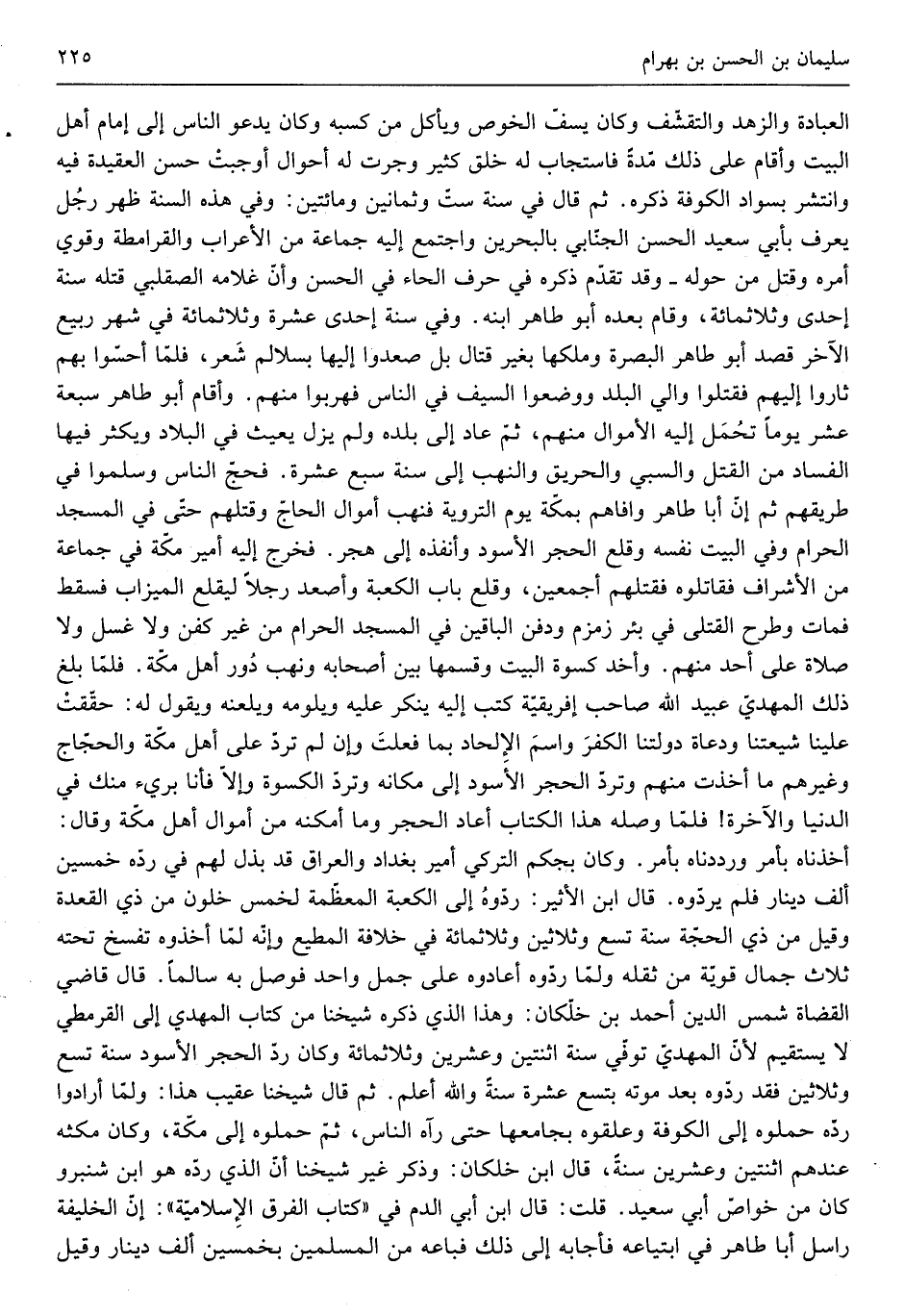 بِأبي سعيد الْحسن الجنّابي بِالْبَحْرَيْنِ وَاجْتمعَ إِلَيْهِ جماعةٌ من الْأَعْرَاب والقرامطة وَقَوي أمره وَقتل من حوله وَقَدْ تقدّم ذكره فِي حرف الْحَاء فِي الْحسن وأنّ غُلَامه الصقلبي قَتله سنة إِحْدَى وَثَلَاث مائَة وَقَامَ بعده أَبُو طَاهِر ابْنه وَفِي سنة إِحْدَى عشرَة وَثَلَاث مائَة فِي شهر ربيع الآخر قصد أَبُو طَاهِر الْبَصْرَة وملكها بِغَيْر قتال بل صعدوا إِلَيْهَا بسلالم شَعر فلمّا أحسّوا بهم ثَارُوا إِلَيْهِم فَقتلُوا وَإِلَى الْبَلَد وَوَضَعُوا السَّيْف فِي النَّاس فَهَرَبُوا مِنْهُم وَأقَام أيو طَاهِر سَبْعَة عشر يَوْمًا تحُمَل إِلَيْهِ الْأَمْوَال مِنْهُم ثمّ عَاد إِلَى بَلَده وَلَمْ يزل يعيث فِي الْبِلَاد وَيكثر فِيهَا الْفساد من الْقَتْل والسبي والحريق والنهب إِلَى سنة سبع عشرَة فحجّ النَّاس وسلموا فِي طريقهم ثُمَّ إنّ أَبَا طَاهِر وافاهم بمكّة يَوْم التَّرويَة فنهب أَمْوَال الحاجّ وقتلهم حتّى فِي الْمَسْجِد الْحَرَام وَفِي الْبَيْت نَفسه وَقلع الْحجر الْأسود وأنفذه إِلَى هجر فَخرج إِلَيْهِ أَمِير مَكَّة فِي جمَاعَة من الْأَشْرَاف فقاتلوه فَقَتلهُمْ أَجْمَعِينَ وَقلع بَاب الْكَعْبَة وأصعد رجلا ليقلع الْمِيزَاب فَسقط فَمَاتَ وَطرح الْقَتْلَى فِي بِئْر زَمْزَم وَدفن البَاقِينَ فِي الْمَسْجِد الْحَرَام من غير كفن وَلَا غسيل وَلَا صَلَاة عَلَى أحدهم