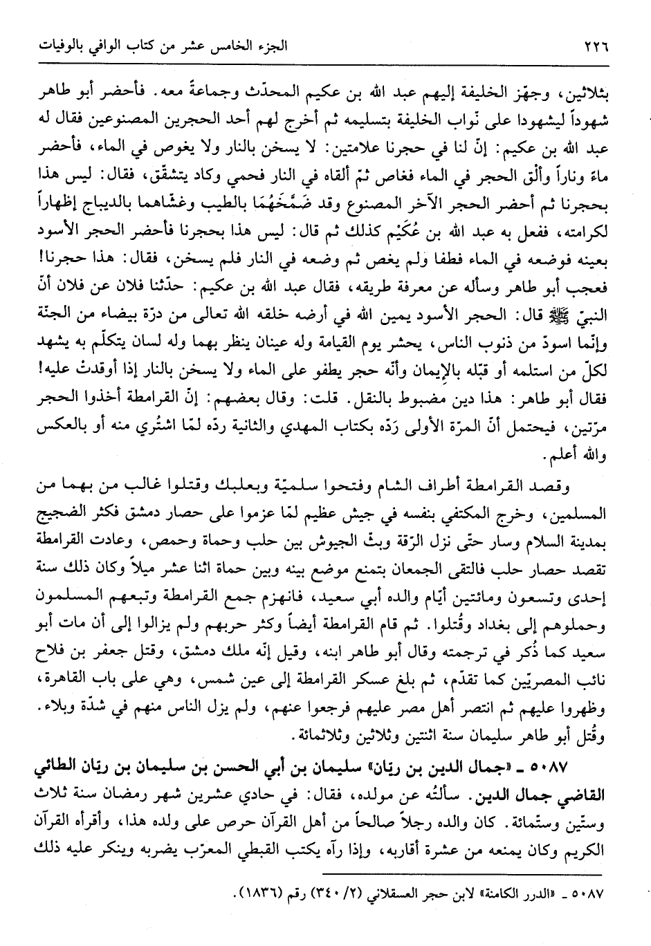 بِثَلَاثِينَ وجهّز الْخَلِيفَة إِلَيْهِم عبد الله بن عكيم المحدّث وَجَمَاعَة مَعَه فأحضر أَبُو طَاهِر شُهُودًا ليشهدوا عَلَى نوّاب الْخَلِيفَة بِتَسْلِيمِهِ ثُمَّ أخرج لَهُم أحد الحجرين المصنوعين فَقَالَ لَهُ عبد الله بن عكيم إِن لَنَا فِي حجرنا علامتين لَا يسخن بالنَّار وَلَا يغوص فِي المَاء فأحضر مَاء وَنَارًا وألْقى الْحجر فِي المَاء فغاص ثمّ أَلْقَاهُ فِي النَّار فحمي وَكَاد يتشقّق فَقَالَ لَيْسَ هَذَا بحجدرنا ثُمَّ أحضر الْحجر الآخر الْمَصْنُوع وَقَدْ ضَمَّخَهُمَا بالطيب وغشّاهما بالديبالج إِظْهَارًا لكرامته فَفعل بِهِ عبد الله بن عُكَيْم كَذَلِك ثُمَّ قَالَ لَيْسَ هَذَا بحجرنا فأحضر الْحجر الْأسود بِعَيْنِه فَوَضعه فِي المَاء فطفا وَلَمْ يغص ثُمَّ وَضعه فِي النَّار فَلم يسخن فَقَالَ هَذَا حجرنا فَعجب أَبُو طَاهِر وَسَأَلَهُ عَن معرفَة طَرِيقه فَقَالَ عبد الله بن عكيم حدّثنا فلَان عَن فلَان أَن النَّبِي صلى الله عَلَيْهِ وَسلم قَالَ الْحجر الْأسود يَمِين الله فِي أرضه خلقه الله تَعَالَى من درّة بَيْضَاء من الجنّة وإنمّا اسودّ من ذنُوب النَّاس يحْشر يَوْم الْقِيَامَة وَلَهُ عينان ينظر بهما وَلَهُ لِسَان يتَكَلَّم بِهِ يشْهد لكلّ من استلمه أَو قبّله بِالْإِيمَان وأنّه حجر يطفو عَلَى المَاء وَلَا يسخن بالنَّار إِذا أوقدتْ عَلَيْهِ فَقَالَ أَبُو طَاهِر هَذَا دين مضبوط بِالنَّقْلِ