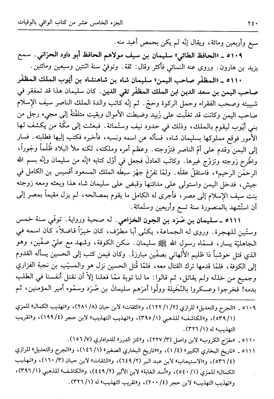 روى لَهُ الْجَمَاعَة يكنّى أَبَا مطرّف كَانَ خيرّاً فَاضلا كَانَ اسْمه فِي الجاهليّة يسَار فَسَماهُ رَسُول الله صلى الله عَلَيْهِ وَسلم سُلَيْمَان سكن الْكُوفَة وَشهد مَعَ عليّ صفّين وَهُوَ الَّذِي قتل حوشباً ذَا ظليم الأُلهاني بصفّين مبارزةً وَكَانَ فِيمَن كتب إِلَى الْحُسَيْن يسْأَله الْقدوم إِلَى الْكُوفَة فَلَمَّا قدمهَا ترك الْقِتَال مَعَه فلمّا قُتل الْحُسَيْن نزل هُوَ والمسّيب بن نجبة الفزري وَجَمِيع من خذله وَلَمْ يُقَاتل ثُمَّ قَالُوا مالنا تَوْبَة ممّا فعلنَا إلاّ أَن نقْتل أَنْفُسنَا فِي الطّلب بدمه فَخَرجُوا وعسكروا بالنُخَيلة وولّوا أمَرهم سليمانَ بن صُرَد وسمّوه أَمِير الْمُؤمنِينَ ثُمَّ