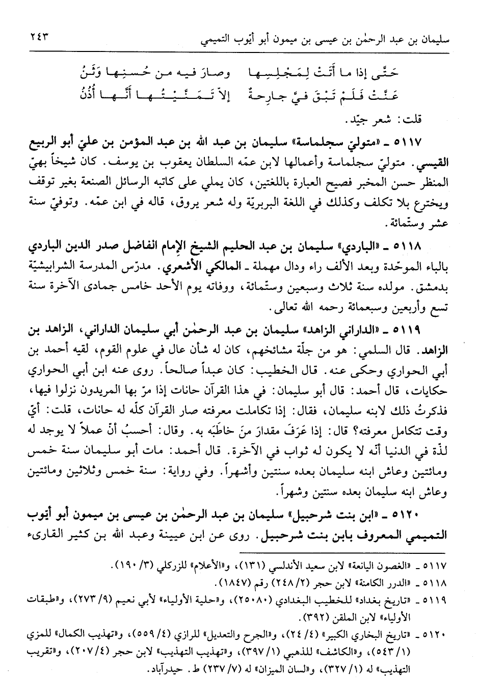 سُلَيْمَان بن عبد الرَّحْمَن أبي سُلَيْمَان الدَّارَانِي الزَّاهِد ابْن الزَّاهِد قَالَ السّلمِيّ هُوَ من جلّة مشائخهم كَانَ لَهُ شَأْن عَال فِي عُلُوم الْقَوْم لقِيه أَحْمد بن أبي الْحوَاري وَحكى عَنهُ قَالَ الْخَطِيب كَانَ عبدا صَالحا روى عَنهُ ابْن أبي الْحوَاري حكايات قَالَ أَحْمد قَالَ أَبُو سُلَيْمَان فِي هَذَا الْقُرْآن حانات إِذا مرّ بِهَا المريدون نزلُوا فِيهَا فذكرتُ ذَلِكَ لِابْنِهِ سُلَيْمَان فَقَالَ إِذا)
