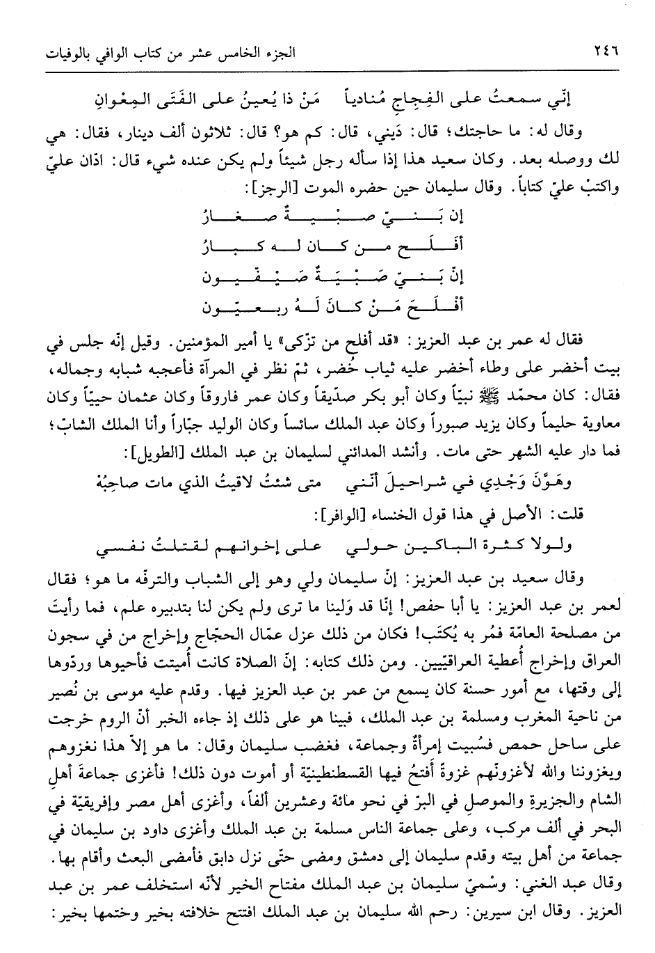 وَقَالَ لَهُ مَا حَاجَتك قَالَ دَيني قَالَ كم هُوَ قَالَ ثَلَاثُونَ ألف دِينَار فَقل هِيَ لَكَ وَوَصله بعد سعيد هَذَا إِذا سَأَلَهُ رجل شَيْئا وَلَمْ يكن عِنْده شَيْء قَالَ ادّان عليّ واكتبْ عليّ كتابا وَقَالَ سُلَيْمَان حِين حَضَره الْمَوْت من الرجز إنّ بَنيّ صَبْيةٌ صغارُ أفَلَح من كَانَ لَهُ كبارُ إنّ بَنيّ صَبْيَةٌ صَيْفيّون أفْلَحَ مَنْ كانَ لَهُ ربعيّون فَقَالَ لَهُ عمر بن عبد الْعَزِيز قَدْ أَفْلح من نزكّي يَا أَمِير الْمُؤمنِينَ وَقيل إنّه جلس فِي بَيت أَخْضَر عَلَى وطاء أَخْضَر عَلَيْهِ ثِيَاب خُضر ثمّ نظر فِي الْمرْآة فأعجبه شبابه وجماله فَقَالَ كَانَ محمّد صلى الله عَلَيْهِ وَسلم نَبيا وَكَانَ أَبُو بكر صدّيقاً وَكَانَ عمر فاروقاً وَكَانَ عُثْمَان حييّاً وَكَانَ مُعَاوِيَة حَلِيمًا وَكَانَ يزِيد صبوراً وَكَانَ عبد الْملك سائساً وَكَانَ الْوَلِيد جبّاراً وَأَنا الْملك الشابّ فَمَا دَار عَلَيْهِ الشَّهْر حتّى مَاتَ وَأنْشد الْمَدَائِنِي لِسُلَيْمَان بن عبد الْملك من الطَّوِيل)