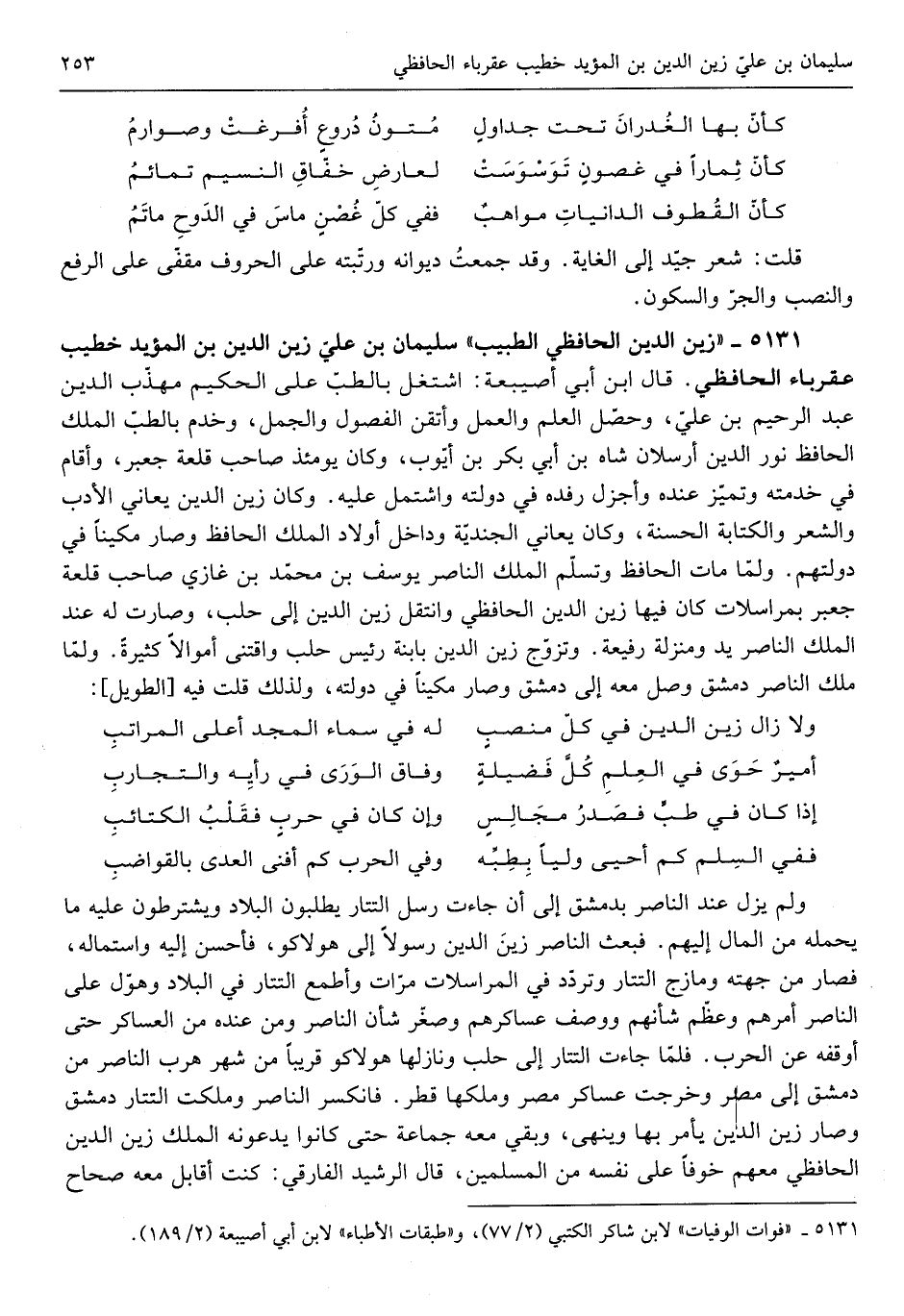 سُلَيْمَان بن عليّ زين الدّين ابْن الْمُؤَيد خطيب عقرباء الحافظي قَالَ ابْن أبي أصيبعة اشْتغل بالطبّ عَلَى الْحَكِيم مهذّب الدّين عبد الرَّحِيم بن عليّ وحصّا الْعلم وَالْعَمَل وأتقن الْفُصُول والجمل وخدم بالطبّ الْملك الْحَافِظ نور الدّين أرسلان شاه بن لأبي بكر بن أيّوب وَكَانَ يَوْمئِذٍ صَاحب قلعة جعبر وَأقَام فِي خدمته وتمّيز عِنْده وأجزل رفده وخوّله فِي دولته واشتمل عَلَيْهِ وَكَانَ زين الدّين يعاني الْأَدَب وَالشعر وَالْكِتَابَة الْحَسَنَة وَكَانَ يعاني الجنديّة وداخل أَوْلَاد الْملك الْحَافِظ وَصَارَ حظيّاً مكيناً فِي دولتهم ولمّا مَاتَ الْحَافِظ وتسلّم الْملك النَّاصِر يُوسُف بن مُحَمَّد بن غَازِي صَاحب حلب قلعة جعبر بمراسلات كَانَ فِيهَا زين الدّين الحافظي وانتقل زين الدّين إِلَى حلب وَصَارَت لَهُ عِنْد الْملك النَّاصِر يَد ومنزلة رفيعة وتزوّج زين الدّين بِابْنِهِ رَئِيس حلب واقتنى أَمْوَالًا كَثِيرَة وَلما ملك النَّاصِر دمشق وصل مَعَه إِلَى دمشق وَصَارَ مكيناً فِي دولته وَلذَلِك قلت فِيهِ من الطَّوِيل