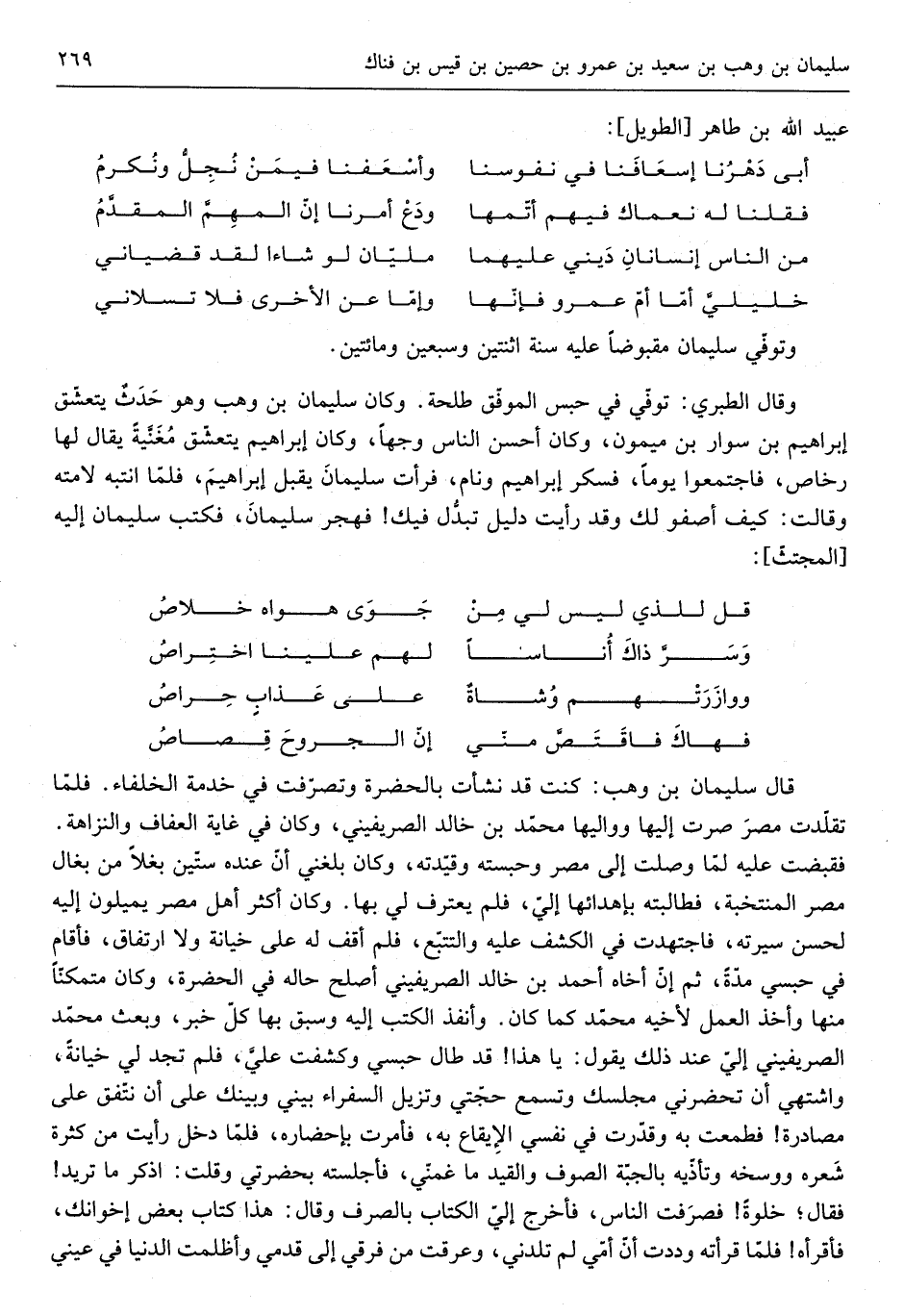 وَقَالَ الطَّبَرِيّ توفيّ فِي حبس الموفّق طَلْحَة وَكَانَ سُلَيْمَان بن وهب وَهُوَ حَدَثُ بتعشّق إِبْرَاهِيم بن سوار بن مَيْمُون وَكَانَ أحسن النَّاس وَجها وَكَانَ إِبْرَاهِيم يتعشّق مُغَنّيةً يُقَال لَهَا رخاص فَاجْتمعُوا يَوْمًا فَسَكِرَ إِبْرَاهِيم ونام فرأت سليمانَ يقبّل إبراهيمَ فلمّا انتبه لامته وَقَالَت كَيْفَ أصفو لَكَ وَقَدْ رَأَيْت دَلِيل تبدُّل فِيك فَهجر سليمانَ فَكتب سُلَيْمَان إِلَيْهِ من المجتثّ)