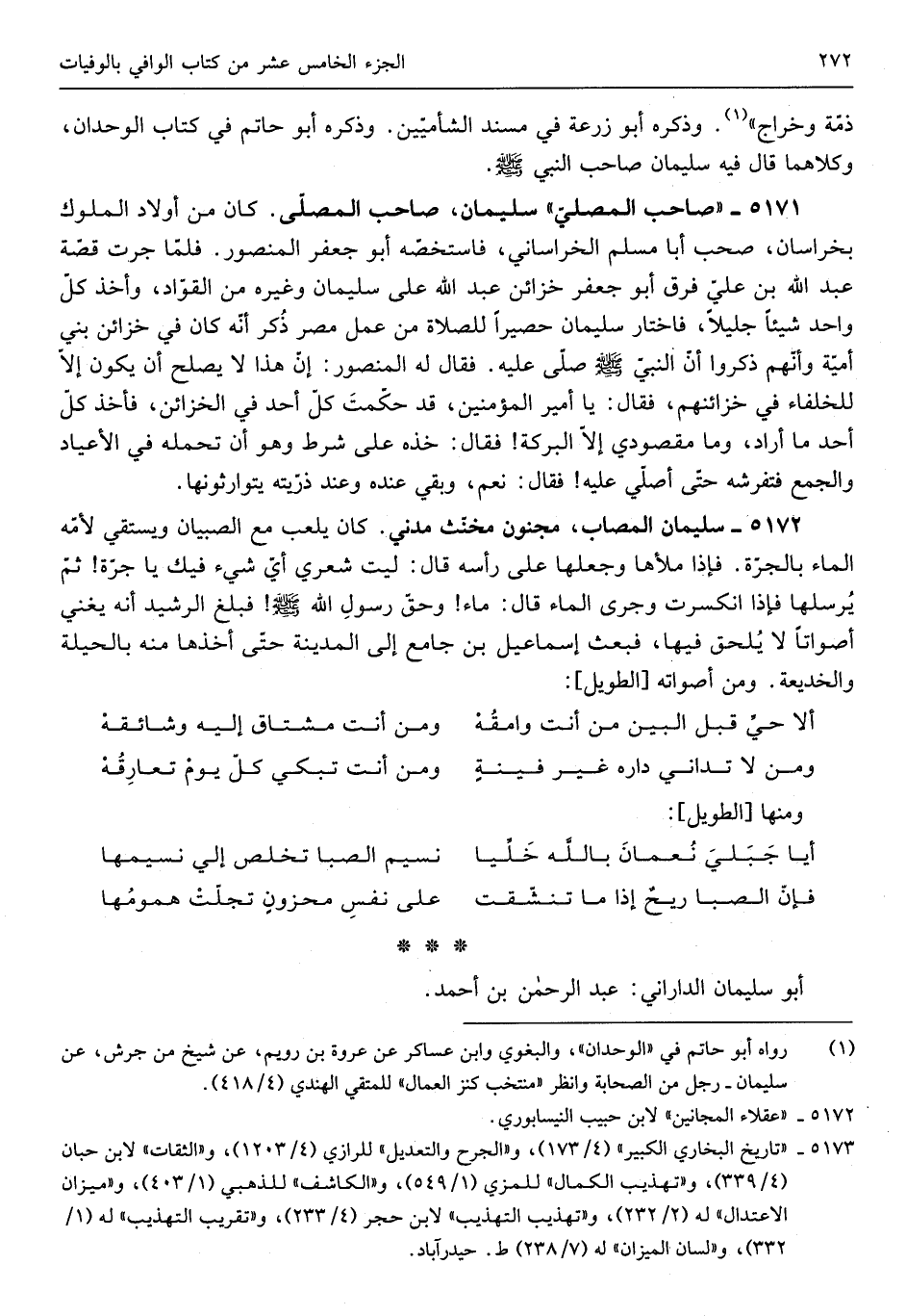 ذمّة وخراج وَذكره أَبُو زرْعَة فِي مُسْند الشاميّين وَذكره أَبُو حَاتِم فِي كتاب الوحدان وَكِلَاهُمَا قَالَ فِيهِ سُلَيْمَان صَاحب النبيّ صلى الله عَلَيْهِ وَسلم