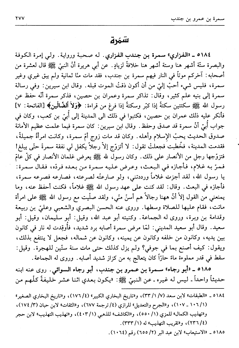 سَمُرَة بن جُنْدُب الْفَزارِيّ لَهُ صُحْبَة وَرِوَايَة ولي إمرة الْكُوفَة وَالْبَصْرَة ستّة أشهر هُنَا وَسنة أشهر هُنَا خلافةٌ لزياد عَن أبي هُرَيْرَة أَن النَّبِي صلى الله عَلَيْهِ وَسلم قَالَ لعشرة من أَصْحَابه أخركم موتا فِي النَّار فيهم سَمُرَة بن جُنْدُب فقد مان مّنا ثَمَانِيَة وَلَمْ يبْق غَيْرِي وَغير سَمُرَة فَلَيْسَ شَيْء أحبّ إليّ من أَن أكون ذقتُ الْمَوْت قبله وَقَالَ ابْن سِيرِين فِي رِسَالَة سَمُرَة إِلَى بنيه علم كثير وَقَالَ تَذَاكر سَمُرَة وَعمْرَان بن حُصَيْن فَذكر سَمُرَة أنّه حفظ عَن رَسُول الله صلى الله عَلَيْهِ وَسلم سكتتين سكتةً إِذا كبّر وسكتةً إِذا فرغ من قِرَاءَة وَلَا الضالّين فَأنْكر عَلَيْهِ ذَلِكَ عمرَان بن حُصَيْن فَكَتَبُوا فِي ذَلِكَ إِلَى الْمَدِينَة إِلَى أبي كَعْب وَكَانَ فِي جَوَاب أُبيّ أنّ سَمُرَة قَدْ صدق وَحفظ وَقَالَ ابْن سِيرِين كَانَ سَمُرَة فِيمَا علمت عَظِيم الْأَمَانَة صَدُوق الحَدِيث يحبّ الْإِسْلَام وَأَهله وَكَانَ قَدْ مَاتَ زوج أمّ سَمُرَة وَكَانَتْ امْرَأَة جميلَة فَقدمت الْمَدِينَة فخُطبت فَجعلت تَقول لَا أتزوّج إلاّ رجلا يكفل لي نَفَقَة سمرةَ حتّى يبلغ فَتَزَوجهَا رجل من الْأَنْصَار عَلَى ذَلِكَ وَكَانَ رَسُول الله صلى الله عَلَيْهِ وَسلم يعرض غلْمَان الْأَنْصَار فِي كلّ عَام فمرّ بِهِ غُلَام فَأَجَازَهُ فِي الْبَعْث وَعرض عَلَيْهِ سَمُرَة من بعده فردّه فَقَالَ سَمُرَة يَا رَسُول الله لقد أجزت غُلَاما ورددتني وَلَو صارعتُه لصرعته فصارعه فصرعه سَمُرَة فَأَجَازَهُ فِي الْبَعْث وَقَالَ لقد كنت عَلَى عهد رَسُول الله صلى الله عَلَيْهِ وَسلم غُلَاما فَكنت أحفظ عَنهُ وَمَا يَمْنعنِي من القَوْل إلاّ أنّ هَهُنَا رجَالًا هم أسنّ منّي وَلَقَد صلّيت مَعَ رَسُول الله صلى الله عَلَيْهِ وَسلم على امْرَأَة مَاتَت فَقَامَ عَلَيْهَا الصَّلَاة وَسطهَا وروى عَنهُ الْحسن الْبَصْرِيّ وَالشعْبِيّ وعليّ بن ربيعَة وَقُدَامَة بن وبر وروى لَهُ الْجَمَاعَة وكنيته أَبُو عبد الله وَقيل أَبُو سُلَيْمَان وَقيل أَبُو سعيد وَقَالَ أَبُو سَمُرَة الديني لمّا مرض سَمُرَة أَصَابَهُ برد شَدِيد فأوقدت لَهُ نَار فِي كَونه بَيْنَ يَدَيْهِ وكانون من خَلفه وَكَانَ عَن يمنه وكانون عَن شِمَاله فَجعل لَا ينْتَفع بذلك وَيَقُول كَيْفَ أصنع بِمَا فِي جوفي وَلَمْ يزل كَذَلِك حَتَّى مَاتَ سنة ستّين لِلْهِجْرَةِ وَقيل سقط فِي قدر مَمْلُوءَة مَاء حارّاً كَانَ يتعالج بِهِ من كزاز شَدِيد أَصَابَهُ وروى لَهُ الْجَمَاعَة