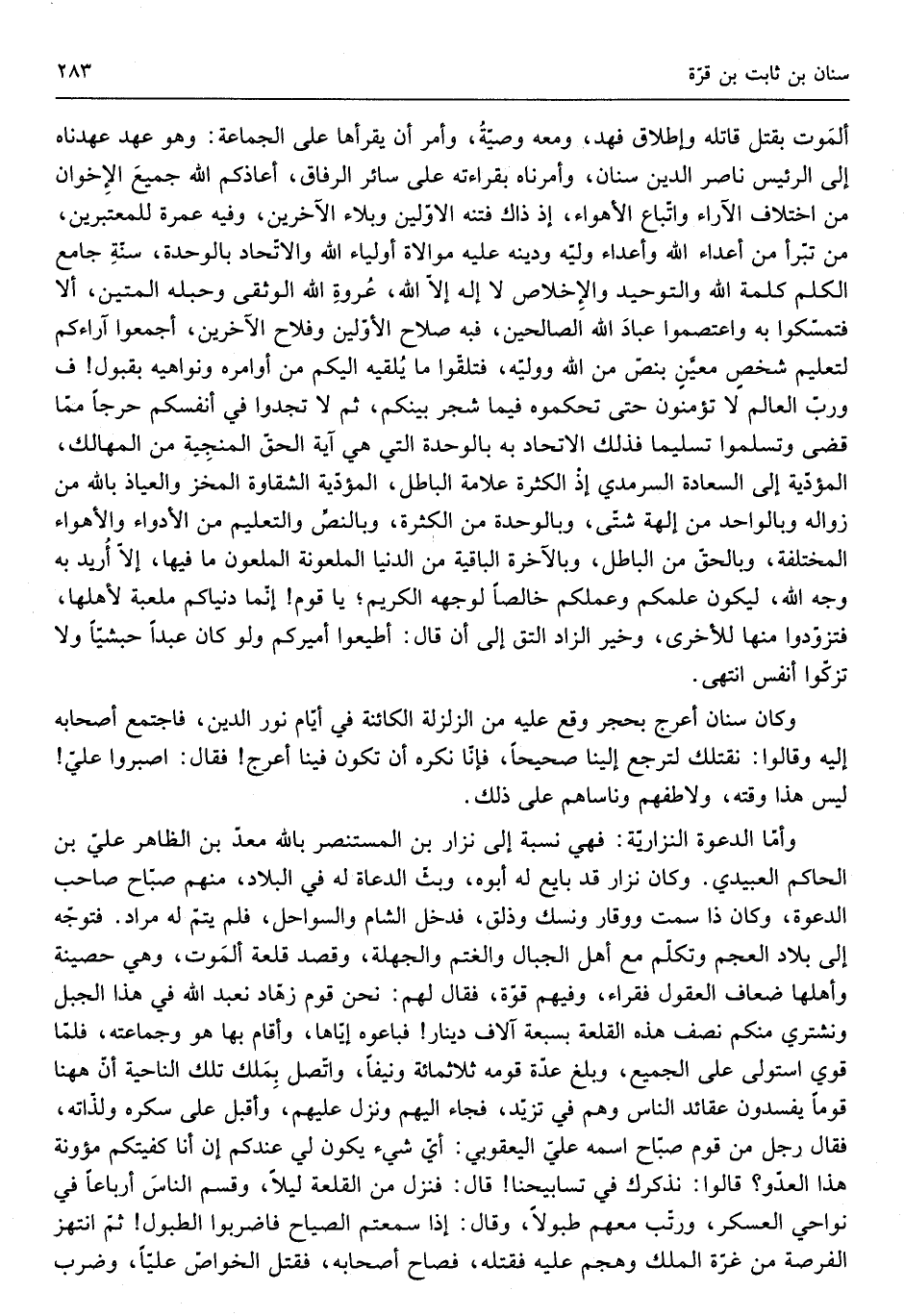 الْمَوْت بقتل قَاتله وَإِطْلَاق فَهد وَمَعَهُ وصيّةً وَأمر أَن يَقْرَأها على الْجَمَاعَة وَهُوَ عهد عهدناه إِلَى الرئيس نَاصِر الدّين سِنَان وأمرناه بقرَاءَته عَلَى سَائِر الرفاق أعاذكم الله جميعَ الإخوان من اخْتِلَاف الآراء واتّباع الْأَهْوَاء إِذْ ذَاكَ فتْنَة الأوّلين وبلاء الآخرين وَفِيه عِبْرَة للمعتبرين وَمن تبرّأ من أَعدَاء الله وأعداء وليّة ودينة عَلَيْهِ مُوالَاة أَوْلِيَاء الله والاتحّاد بالوحدة سنّةِ جَامع الْكَلم كَلمه الله والتوحيد وَالْإِخْلَاص لَا إِلَه إلاّ الله عُروةِ الله الوثقى وحبله المتين أَلا فتمسّكوا بِهِ واعتصموا عبّاد الله الصَّالِحين فَلهُ صَلَاح الأوّلين وفلاح الآخرين اجْمَعُوا آراءكم لتعليم شخصٍ معَّينٍ بنصّ من الله ووليّه فتلقّوا مَا يُلقيه إِلَيْكُم من أوامره ونواهيه بِقبُول فَلَا وربّ الْعَالمين لَا تؤمنون حَتَّى تحكموه فِيمَا شجر بَيْنكُم ثُمَّ لَا تَجدوا فِي أَنفسكُم حرجاً ممّا قضى وتسلموا تَسْلِيمًا فَذَلِك الِاتِّحَاد بِهِ بالوحدة الَّتِي هِيَ أَيَّة الحقّ المنجِية من المهالك المؤدية إِلَى السَّعَادَة السرمدّية إذْ الْكَثْرَة عَلامَة الْبَاطِل المؤدّية الشقاوة المخزية وَالْعِيَاذ بِاللَّه من زَوَاله وبالواحد من إلهة شتّى وبالوحدة من الْكَثْرَة بالنصِّ والتعليم من الأدواء والأهواء الْمُخْتَلفَة وبالحقّ من الْبَاطِل وبالآخرة الْبَاقِيَة من الدُّنْيَا الملعونة الملعون مَا فِيهَا إِلَّا مَا أُريد بِهِ وَجه الله ليَكُون علمكُم وعملكم خَالِصا لوجهه الْكَرِيم يَا قوم إنمّا دنياكم ملعبة لأَهْلهَا فتووّدوا مِنْهَا لِلْأُخْرَى وَخير الزَّاد التَّقْوَى إِلَى أَن قَالَ أطِيعُوا أميركم وَلَو كَانَ عبدا حبشيّاً وَلَا تزكّوا أَنفسكُم انْتهى وَكَانَ سِنَان أعرج بِحجر وَقع عَلَيْهِ من الزلزلة الكائنة فِي أيّام نور الدّين فَاجْتمع أَصْحَابه إِلَيْهِ وَقَالُوا نقتلك لترجع إِلَيْنَا صَحِيحا فإنّا نكره أَن تكون فِينَا أعرج فَقَالَ اصْبِرُوا عَليّ لَيْسَ)
