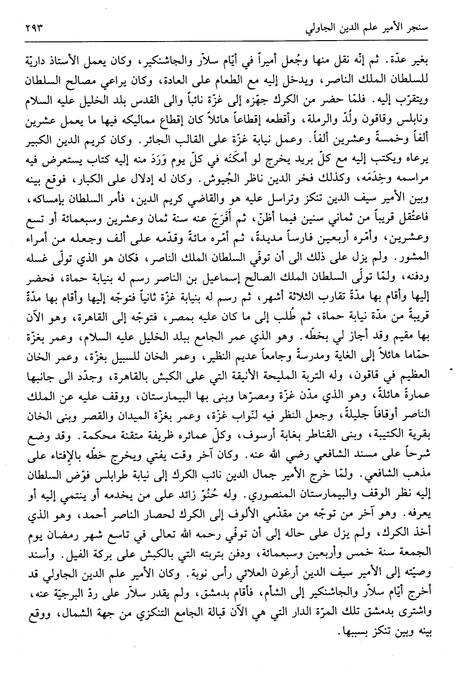 وَالْقَاضِي كريم الدّين فَأمر السُّلْطَان بإمساكه فاعتُقل قَرِيبا من ثَمَانِي سِنِين فِيمَا أظنّ ثُمَّ أفرَجَ عَنهُ سنة ثَمَان وَعشْرين وَسبع مائَة أَو تسع وَعشْرين وأمّره أَرْبَعِينَ فَارِسًا مديدةً ثمّ أمّره مائَة وقدّمه عَلَى ألف وَجعله من أُمَرَاء المشور وَلَمْ يزل عَلَى ذَلِكَ إِلَى أَن توفّي السُّلْطَان الْملك النَّاصِر فَكَانَ هُوَ الَّذِي تولىّ غسله وَدَفنه ولمّا توليّ السُّلْطَان الْملك الصَّالح إِسْمَاعِيل بن النَّاصِر رسم لَهُ بنيابة حما فَحَضَرَ إِلَيْهَا وَأقَام بِهَا مدّةً تقَارب الثَّلَاثَة أشهر ثُمَّ رسم لَهُ بنيابة غزّة ثالنياً فتوجّه إِلَيْهَا وَأقَام بِهَا مدّةً قريبَة من مدّة نِيَابَة حماه ثُمَّ طُلب إِلَى مَا كَانَ عَلَيْهِ بِمصْر فتوجّه إِلَى الْقَاهِرَة وَهُوَ الْآن بِهَا مُقيم وَقَدْ أجَاز لي بخطّة وَهُوَ الَّذِي عمر الْجَامِع بِبَلَد الْخَلِيل عَلَيْهِ السَّلَام وَعمر بغزّة حمّاما هائلاً إِلَى الْغَايَة ومدرسةً وجامعاً عديم النظير وَعمر الخان للسبيل بغزّة وَعمر الخان الْعَظِيم فِي قاقون وَلَهُ التربة الملحية الأنيقة الَّتِي عَلَى الكبس بِالْقَاهِرَةِ وجدّد إِلَى جَانبهَا عمَارَة هائلةً وَهُوَ الَّذِي مدّن غزّة ومصرّها وَبنى بِهَا البيمارستان ووقف عَلَيْهِ عَن الْملك النَّاصِر أوقافاً جليلةً وَجعل النّظر فِيهِ لنوّاب غزّة وَعمر بغزّة الميدان وَالْقصر وَبنى الخان بقرية الكتيبة وَبنى القناطر بغابة أرسوف وَكَلّ عمائره ظريفة متقنة محكمَة وَقَدْ وضع شرحاً عَلَى مُسْند الشَّافِعِي رَضِي الله عَنهُ وَكَانَ آخر وَقت يُفْتِي وَيخرج خطّه بالإفتاء عَلَى مَذْهَب الشَّافِعِي ولمّا خرج الْأَمِير جمال الدّين نَائِب الكرك إِلَى نِيَابَة طرابلس فوّض السُّلْطَان إِلَيْهِ نظر الْوَقْف والبيمارستان المنصوري وَلَهُ حُنُوّ زَائِد عَلَى من يَخْدمه أَو ينتمي إِلَيْهِ أَو يعرفهُ وَهُوَ آخر من نوجّه من مقدّمي الألوف إِلَى الكرك لحصار النَّاصِر أَحْمد وَهُوَ الَّذِي أَخذ الكرك وَلَمْ يزل عَلَى حَاله إِلَى أَن توفّي رَحمَه الله تَعَالَى فِي تَاسِع شهر رَمَضَان يَوْم الْجُمُعَة سنة خمس وَأَرْبَعين وَسبع مائَة وَدفن بتربته الَّتِي بالكبش عَلَى بركَة الْفِيل وَأسْندَ وصيّته إِلَى الْأَمِير سيف الدّين أرغون العلائي رَأس نوبَة وَكَانَ الْأَمِير علم الدّين الجاولي قَدْ أخرج أيّام سلاّر والجاشنكير إِلَى الشَّام فَأَقَامَ بِدِمَشْق وَلَمْ يقدر سلاّر عَلَى ردّ البرجيّة عَنهُ وَاشْترى بِدِمَشْق تِلْكَ المرّة الدَّار الَّتِي هِيَ الْآن قبالة التنكزي من جِهَة الشمَال وَوَقع بَينه وَبَين تنكر بِسَبَبِهَا