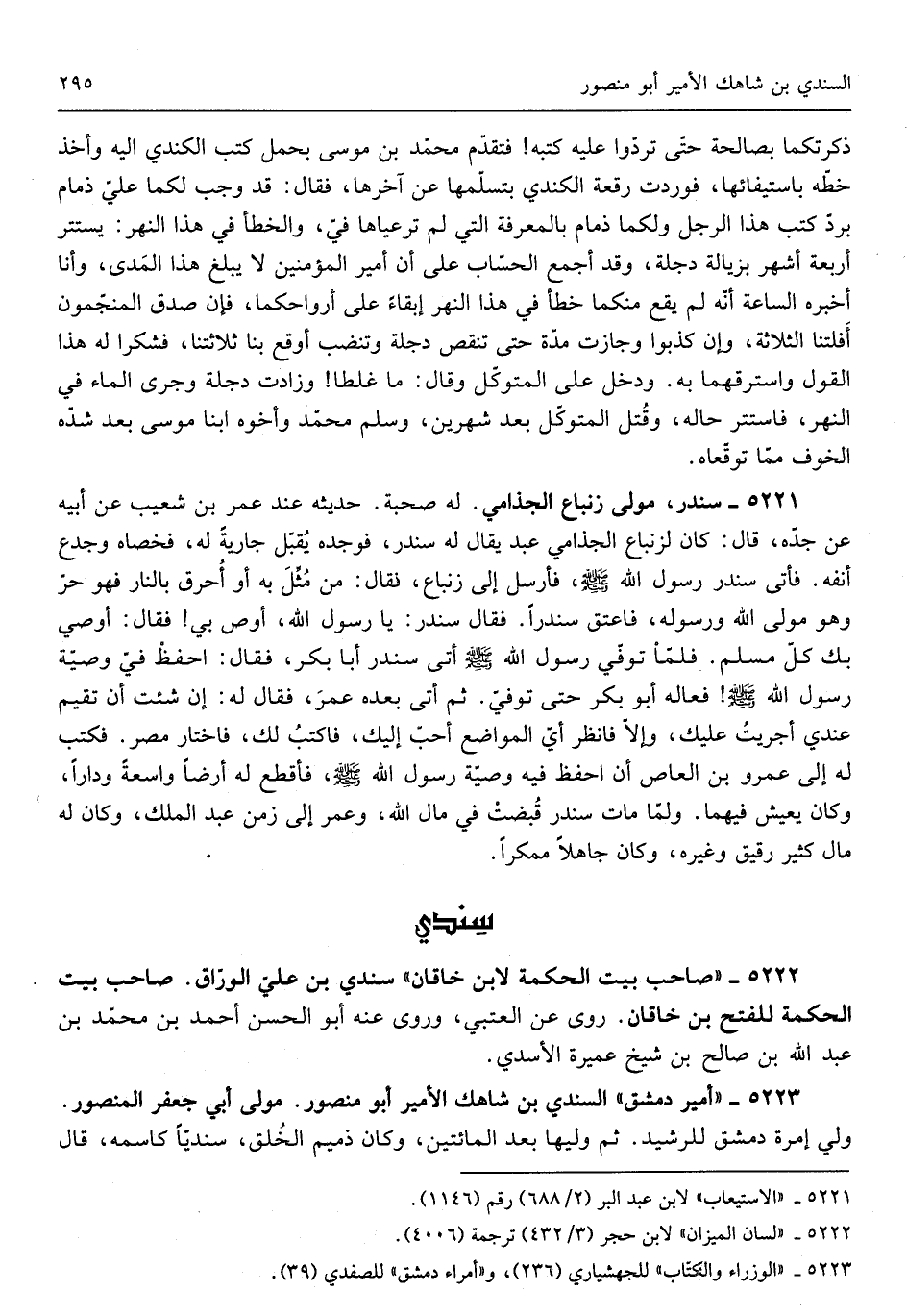 لَهُ صُحْبَة حَدِيثه عِنْد عمر بن شُعَيْب عَن أَبِيه عَن جدّه قَالَ كَانَ لزنباع الجذامي عبد يُقَال لَهُ سندر فَوَجَدَهُ يُقبّل جَارِيَة لَهُ فخصاه وجدع أَنفه فَأتى سندر رَسُول الله صلى الله عَلَيْهِ وَسلم فَأرْسل إِلَى زنباع فَقَالَ من مُثِّلَ بِهِ أَو أُحرق بالنَّار فَهُوَ حرّ وَهُوَ مولى الله وَرَسُوله فاعتق سندراً فَقَالَ سندر يَا رَسُول الله أوص بِي فَقَالَ أوصِي بك كلّ مُسلم