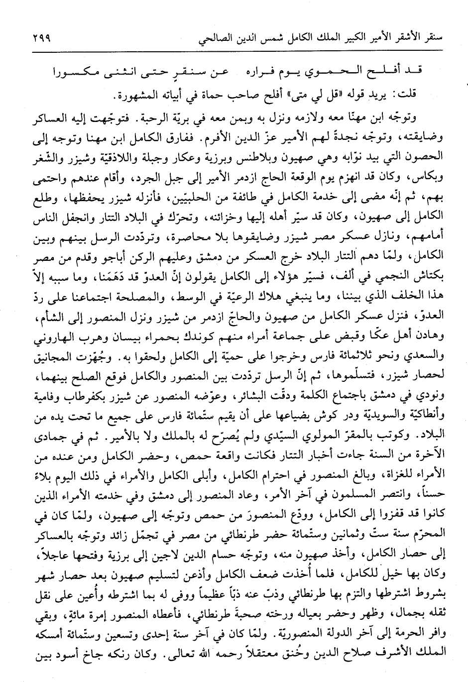 وتوجّه ابْن مهنّا مَعَه ولازمه وَنزل بِهِ وبمن مَعَه فِي بريّة الرحبة فتوجّهت إِلَيْهِ العساكر وضايقته وتوجّه نجدةً لَهُم الْأَمِير عزّ الدّين الأفرم فَفَارَقَ الكاملُ ابنَ مهنّا وتوجّه إِلَى الْحُصُون الَّتِي بيد نوّابه وَهِي صهيون وبلاطنس وبرزية وعكّار وجبلة واللاذقية وشيزر والشغر وبكاس وَكَانَ قَدْ انهزم يَوْم الْوَقْعَة الحاجّ ازدمر الْأَمِير إِلَى جبل الجرد وَأقَام عِنْدهم واحتمى بهم ثُمَّ إنّه مضى إِلَى خدمَة الْكَامِل فِي طَائِفَة من الحلبيّين فأنزله بشيزر يحفظها وطلع الْكَامِل إِلَى صهيون وَكَانَ قَدْ سيّر أَهله إِلَيْهَا وخزائنه وتحرّك فِي الْبِلَاد التتار وانجفل النَّاس أمامهم ونازل عَسْكَر مصر شيزر وضايقوها بِلَا محاصرة وتردّدت الرُّسُل بَينهم وَبَين الْكَامِل ولمّا دهم التتار الْبِلَاد خرج الْعَسْكَر من دمشق وَعَلَيْهِم الرُّكْن أباجو وَقدم من مصر بكتاش النجمي فِي ألفن فسيّر هَؤُلَاءِ إِلَى الْكَامِل يَقُولُونَ إنّ العدوّ قَدْ دَهَمَنا وَمَا سَببه إلاّ هَذَا الْخلف الَّذِي بَيْننَا وَمَا يَنْبَغِي هَلَاك الرعيّة فِي الْوسط والمصلحة اجتماعنا عَلَى ردّ العدوّ فَنزل عَسْكَر الْكَامِل من صهيون والحاجّ ازدمر من شيزر وَنزل الْمَنْصُور إِلَى الشَّام وهادن أهل عكّا وَقبض عَلَى جمَاعَة أُمَرَاء مِنْهُم كوندك بِحَمْرَاء بيسان وهرب الهاروني وَالسَّعْدِي وَنَحْو ثَلَاث مائَة فَارس وَخَرجُوا عَلَى حميّة إِلَى الْكَامِل وَلَحِقُوا بِهِ وجُهّزت المناجيق لحصار شيزر فتسلّموها ثُمَّ إنّ الرُّسُل تردّت بَيْنَ الْمَنْصُور والكامل فَوَقع الصُّلْح بَينهمَا وَنُودِيَ فِي دمشق لِاجْتِمَاع الْكَلِمَة ودقّت البشائر وعوّضه الْمَنْصُور عَن شيزر بِكفْر طَابَ وفامية وأنطاكيّة والسويديّة ودركوش بضياعها عَلَى أَن يُقيم ستّ مائَة فَارس عَلَى جَمِيع مَا تَحْتَ يَده من الْبِلَاد وكوتب بالمقرّ العالي المولوي السيّدي وَلَمْ يُصرّح لَهُ بِالْملكِ وَلَا بالأمير ثُمَّ فِي جُمَادَى الْآخِرَة من السّنة جَاءَت أَخْبَار التتار فَكَانَت وَاقعَة حمص وَحضر الْكَامِل وَمن عِنْده من الْأُمَرَاء للغزاة وَبَالغ الْمَنْصُور فِي احترام الْكَامِل وأبلى الْكَامِل والأمراء فِي ذَلِكَ الْيَوْم بلَاء حسنا وانتصر الْمُسلمُونَ فِي آخر الْأَمر وَعَاد الْمَنْصُور إِلَى دمشق وَفِي خدمته الْأُمَرَاء الَّذين كَانُوا قَدْ قفزوا إِلَى الْكَامِل وودّع الْكَامِل المنصورَ من حمص وتوجّه إِلَى صهيون ولمّا كَانَ فِي المحرّم سنة ستّ وَثَمَانِينَ وستّ مائَة حضر طرنطائي من مصر فِي تجمّل زَائِد وتوجّه بالعساكر إِلَى حِصَار الْكَامِل وَأخذ صهيون مِنْهُ وتوجّه حسام الدّين لاجين إِلَى برزية وَفتحهَا عَاجلا وَكَانَ بِهَا خيل للكامل فَلَمَّا أخذت ضعف الْكَامِل وأذعن لتسليم صهيون بعد)