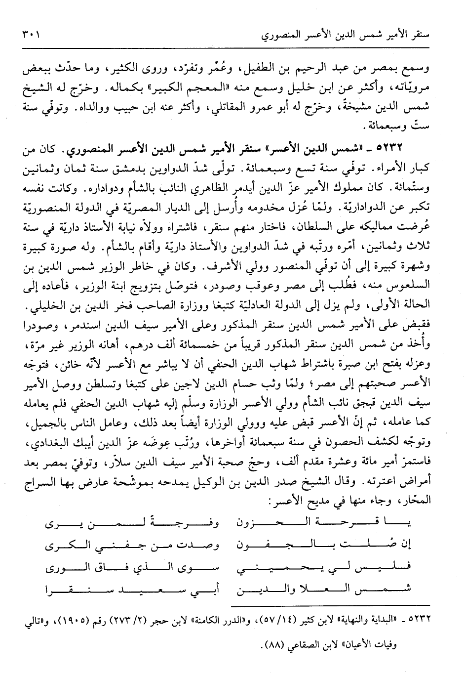 سنقر الْأَمِير شمس الدّين الأعسر المنصوري كَانَ من كبار الْأُمَرَاء توفيّ سنة تسع وَسبع مائَة تولىّ شدّ الدَّوَاوِين بِدِمَشْق سنة ثَمَان وَثَمَانِينَ وستّ مائَة كَانَ مَمْلُوك الْأَمِير عزّ الدّين أيدمر الظَّاهِرِيّ النَّائِب بِالشَّام ودواداره وَكَانَتْ نَفسه تكبر عَن الدواداريّة ولمّا عُزل مخدومه وأُرسل إِلَى الديار المصريّة فِي الدولة المنصوريّة عُرضت مماليكه عَلَى السُّلْطَان فَاخْتَارَ مِنْهُم سنقر فَاشْتَرَاهُ وولاّه نِيَابَة الْأُسْتَاذ داريّة فِي سنة ثَلَاث وَثَمَانِينَ وأمّره ورتَبه فِي شدّ الدَّوَاوِين والأستاذ داريّة وَأقَام بِالشَّام وَلَهُ صُورَة كَبِيرَة وشهرة كَبِيرَة إِلَى أَن توفيذ الْمَنْصُور وَولي الْأَشْرَف وَكَانَ فِي خاطر الْوَزير شمس الدّين ابْن السلعوس مِنْهُ فطْلب إِلَى مصر وعوقب وصودر فتوصّل بتزويج ابْنه الْوَزير فَأَعَادَهُ إِلَى الْحَالة الأولى وَلَمْ يزل إِلَى الدولة العادليّة كتبغا ووزارة الصاحب فَخر الدّين ابْن الخليلي فَقبض عَلَى الْأَمِير شمس الدّين سنقر الْمَذْكُور وَعَلَى الْأَمِير سيف الدّين اسندمر وصودرا وأُخذ من شمس الدّين سنقر الْمَذْكُور قَرِيبا من خمس مائَة ألف دِرْهَم أهانه الْوَزير غير مرذة وعزله بِفَتْح ابْن صبرَة بِاشْتِرَاط شهَاب الدّين الْحَنَفِيّ أَن لَا يُبَاشر مَعَ الأعسر لأنّه خائن فتوجّه الأعسر صحبتهم إِلَى مصر وأمّا وثب حسام الدّين لاجين عَلَى كتبغتا وتسلطن وَوصل الْأَمِير سيف الدّين قبجق نَائِب الشَّام وَولي الأعسر الوزارة وسلّم إِلَيْهِ شهَاب الدّين الْحَنَفِيّ فَلم يعامله كَمَا عَامله ثُمَّ إنّ الأعسر قبض عَلَيْهِ وَولي الوزارة أَيْضا بعد ذَلِك وعامل النَّاس بالجميل وتوجّه لكشف الْحُصُون فِي)
