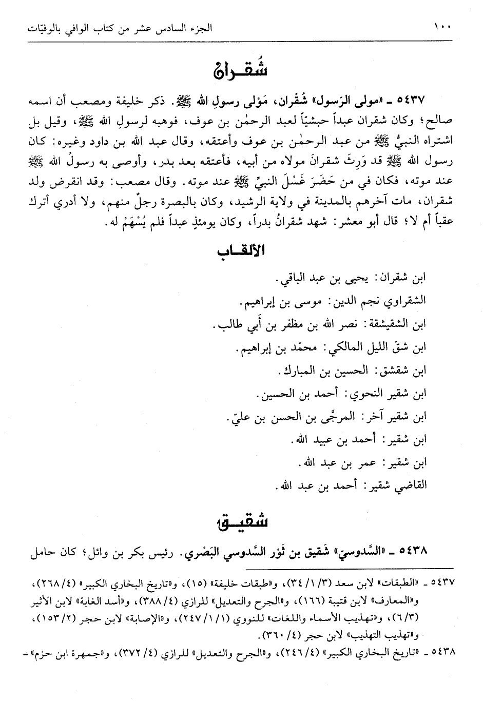 شقران مولى رَسُول الله صلى الله عَلَيْهِ وَسلم ذكر خَليفَة وَمصْعَب أَن اسْمه صَالح وَكَانَ شقران عبدا حَبَشِيًّا لعبد الرَّحْمَن بن عَوْف فوهبه لرَسُول الله صلى الله عَلَيْهِ وَسلم وَقيل بل اشْتَرَاهُ النَّبِي صلى الله عَلَيْهِ وَسلم من عبد الرَّحْمَن بن عَوْف وَأعْتقهُ وَقَالَ عبد الله بن دَاوُد وَغَيره كَانَ رَسُول الله صلى الله عَلَيْهِ وَسلم قد ورث شقران مَوْلَاهُ من أَبِيه فَأعْتقهُ بعد بدر وَأوصى بِهِ رَسُول الله صلى الله عَلَيْهِ وَسلم عِنْد مَوته فَكَانَ فِي من حضر غسل النَّبِي صلى الله عَلَيْهِ وَسلم عِنْد مَوته وَقَالَ مُصعب وَقد انقرض ولد شقران مَاتَ آخِرهم بِالْمَدِينَةِ فِي ولَايَة الرشيد وان بِالْبَصْرَةِ رجل مِنْهُم وَلَا أَدْرِي أترك عقباً أم لَا قَالَ أَبُو معشر شهد شقران بَدْرًا وَكَانَ يَوْمئِذٍ عبدا فَلم يُسهم لَهُ
