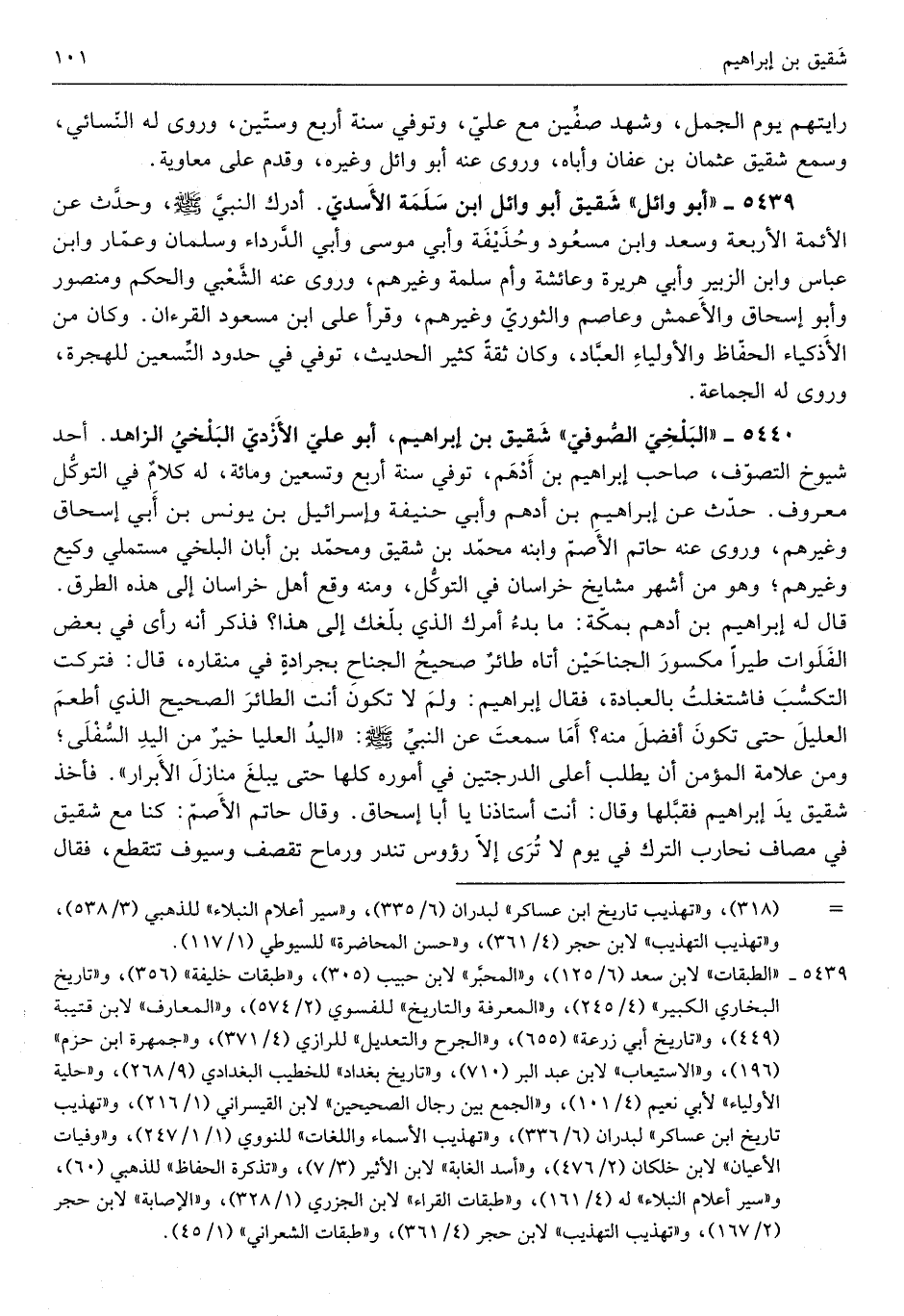 شَقِيق بن إِبْرَاهِيم أَبُو عَليّ الْأَزْدِيّ الْبَلْخِي الزَّاهِد أحد شُيُوخ التصوف صَاحب إِبْرَاهِيم بن ادهم توفّي سنة أَربع وَتِسْعين وَمِائَة لَهُ كَلَام فِي التَّوَكُّل مَعْرُوف حدث عَن إِبْرَاهِيم بن ادهم وَأبي حنيفَة وَإِسْرَائِيل بن يُونُس بن أبي إِسْحَاق وَغَيرهم وروى عَنهُ حَاتِم الْأَصَم وَابْنه مُحَمَّد بن شَقِيق وَمُحَمّد بن أبان الْبَلْخِي مستملي وَكِيع وَغَيرهم وَهُوَ من أشهر مَشَايِخ خُرَاسَان فِي التَّوَكُّل وَمِنْه وَقع أهل خُرَاسَان إِلَى هَذِه الطّرق قَالَ لَهُ إِبْرَاهِيم بن أدهم بِمَكَّة مَا بَدْء أَمرك الَّذِي بلغك إِلَى هَذَا فَذكر أَنه رأى فِي بعض الفلوات طيراً مكسور الجناحين أَتَاهُ طَائِر صَحِيح الْجنَاح بجرادة فِي منقاره قَالَ فَتركت التكسب فاشتغلت بِالْعبَادَة فَقَالَ إِبْرَاهِيم وَلم لَا تكون أَنْت الطَّائِر الصَّحِيح الَّذِي أطْعم العليل حَتَّى تكون أفضل مِنْهُ أما سَمِعت عَن النَّبِي صلى الله عَلَيْهِ وَسلم الْيَد الْعليا خير من الْيَد السُّفْلى وَمن عَلامَة الْمُؤمن أَن يطْلب أَعلَى الدرجتين فِي أُمُوره كلهَا حَتَّى يبلغ منَازِل الْأَبْرَار فَأخذ شَقِيق يَد إِبْرَاهِيم فقبلها وَقَالَ أَنْت أستاذنا يَا أَبَا إِسْحَاق وَقَالَ حَاتِم الْأَصَم كُنَّا مَعَ شَقِيق فِي مصَاف نحارب التّرْك فِي يَوْم لَا ترى إِلَّا رُؤُوس تندثر ورماح تقصف وسيوف تتقطع فَقَالَ