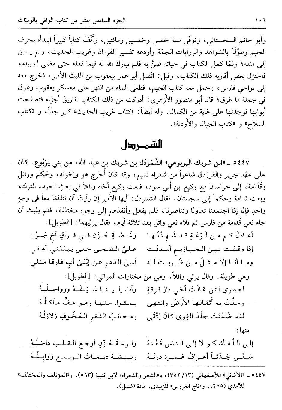 الشمردل ابْن شريك بن عبد الله من بني يَرْبُوع كَانَ على عهد جرير والفرزدق شَاعِرًا من شعراء تَمِيم وَقد كَانَ أخرج هُوَ وَإِخْوَته حكم وَوَائِل وَقُدَامَة إِلَى خُرَاسَان مَعَ وَكِيع بن أبي سود فَبعث وَكِيع أَخَاهُ وائلاً فِي بعث لِحَرْب التّرْك وَبعث قدامَة وَحكما إِلَى سجستان فَقَالَ الشمردل أَيهَا الْأَمِير إِن رَأَيْت أَن تنفذنا مَعًا فِي وَجه وَاحِد فَإنَّا إِذا اجْتَمَعنَا تعاونا وتناصرنا فَلم يفعل وأنفذهم إِلَى وُجُوه مُخْتَلفَة فَلم يلبث أَن جَاءَ نعي قدامَة من فَارس ثمَّ تلاه نعي وَائِل بعد ثَلَاثَة أَيَّام فَقَالَ يرثيهما