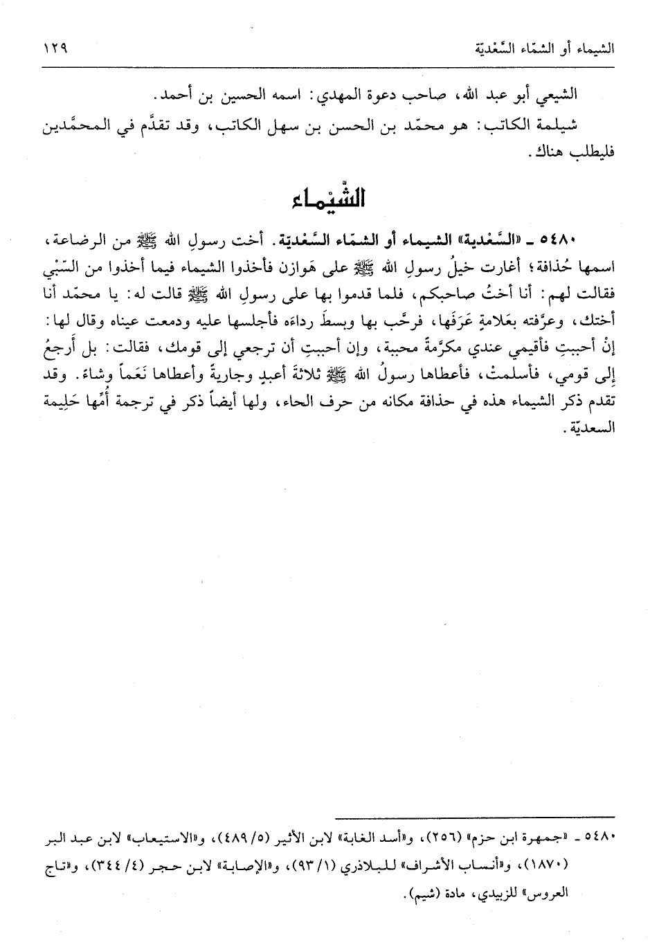 الشيماء أَو الشماء السعدية أُخْت رَسُول الله صلى الله عَلَيْهِ وَسلم من الرضَاعَة اسْمهَا حذاقة أغارت خيل رَسُول الله صلى الله عَلَيْهِ وَسلم على هوَازن فَأخذُوا الشيماء فيا أخذُوا من السَّبي فَقَالَت لَهُم أَنا أُخْت صَاحبكُم فَلَمَّا قدمُوا بهَا على رَسُول الله صلى الله عَلَيْهِ وَسلم قَالَت لَهُ يَا مُحَمَّد أَنا أختك وعرفته بعلامة عرفهَا فَرَحَّبَ بهَا وَبسط لَهَا رِدَاءَهُ فأجلسها عَلَيْهِ ودمعت عَيناهُ وَقَالَ لَهَا إِن أَحْبَبْت فأقيمي عِنْدِي مكرمَة محببة وَإِن أَحْبَبْت أَن تَرْجِعِي إِلَى قَوْمك فَقَالَت بل أرجع إِلَى قومِي فَأسْلمت فَأَعْطَاهَا رَسُول الله صلى الله عَلَيْهِ وَسلم ثَلَاثَة أعبد وَجَارِيَة وَأَعْطَاهَا نعما وَشاء وَقد تقدم ذكر الشيماء هَذِه فِي حذاقة مَكَانَهُ من حرف الْحَاء وَلها أَيْضا ذكر فِي تَرْجَمَة أمهَا حليمة السعدية