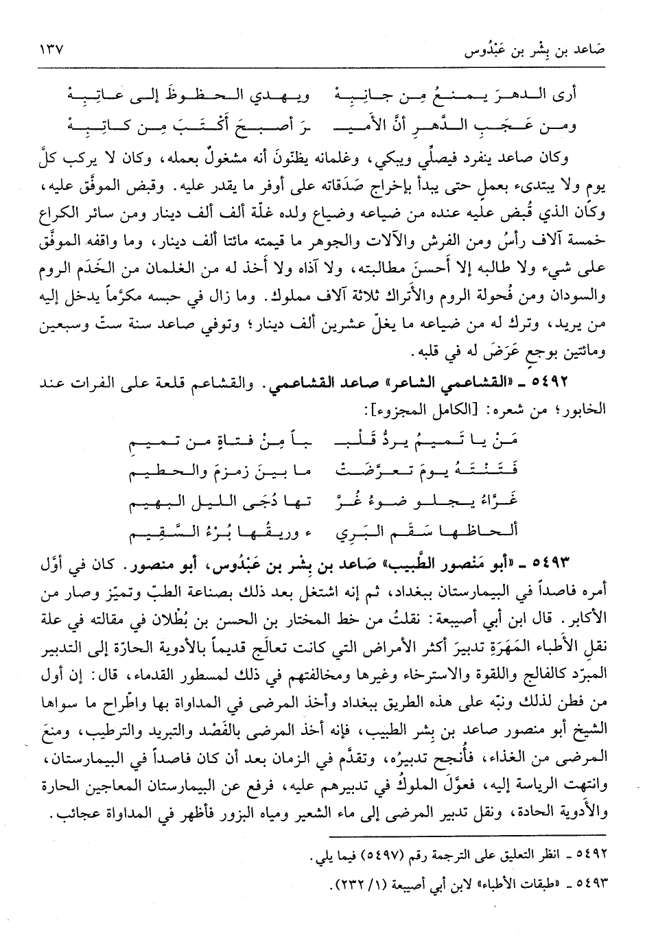 صاعد بن بشر بن عَبدُوس أَبُو مَنْصُور كَانَ فِي أول أمره فاصداً فِي البيمارستان بِبَغْدَاد ثمَّ إِنَّه اشْتغل بعد ذَلِك بصناعة الطِّبّ وتميز وَصَارَ من الأكابر قَالَ ابْن أَبُو أصيبعة نقلت من خطّ الْمُخْتَار نب الْحسن بن بطلَان فِي مقَالَته فِي عِلّة نقل الْأَطِبَّاء المهرة تَدْبِير أَكثر الْأَمْرَاض الَّتِي كَانَت تعالج قَدِيما بالأدوية الحارة إِلَى التَّدْبِير الْمبرد كالفالج واللقوة والاسترخاء وَغَيرهَا ومخالفتهم فِي ذَلِك لمسطور القدماء قَالَ إِن أول من فطن لذَلِك وَنبهَ على هَذِه الطَّرِيق بِبَغْدَاد وَأخذ المرضى فِي المداواة بهَا وأطرح مَا سواهَا الشَّيْخ أَبُو مَنْصُور صاعد بن بشر الطَّبِيب)