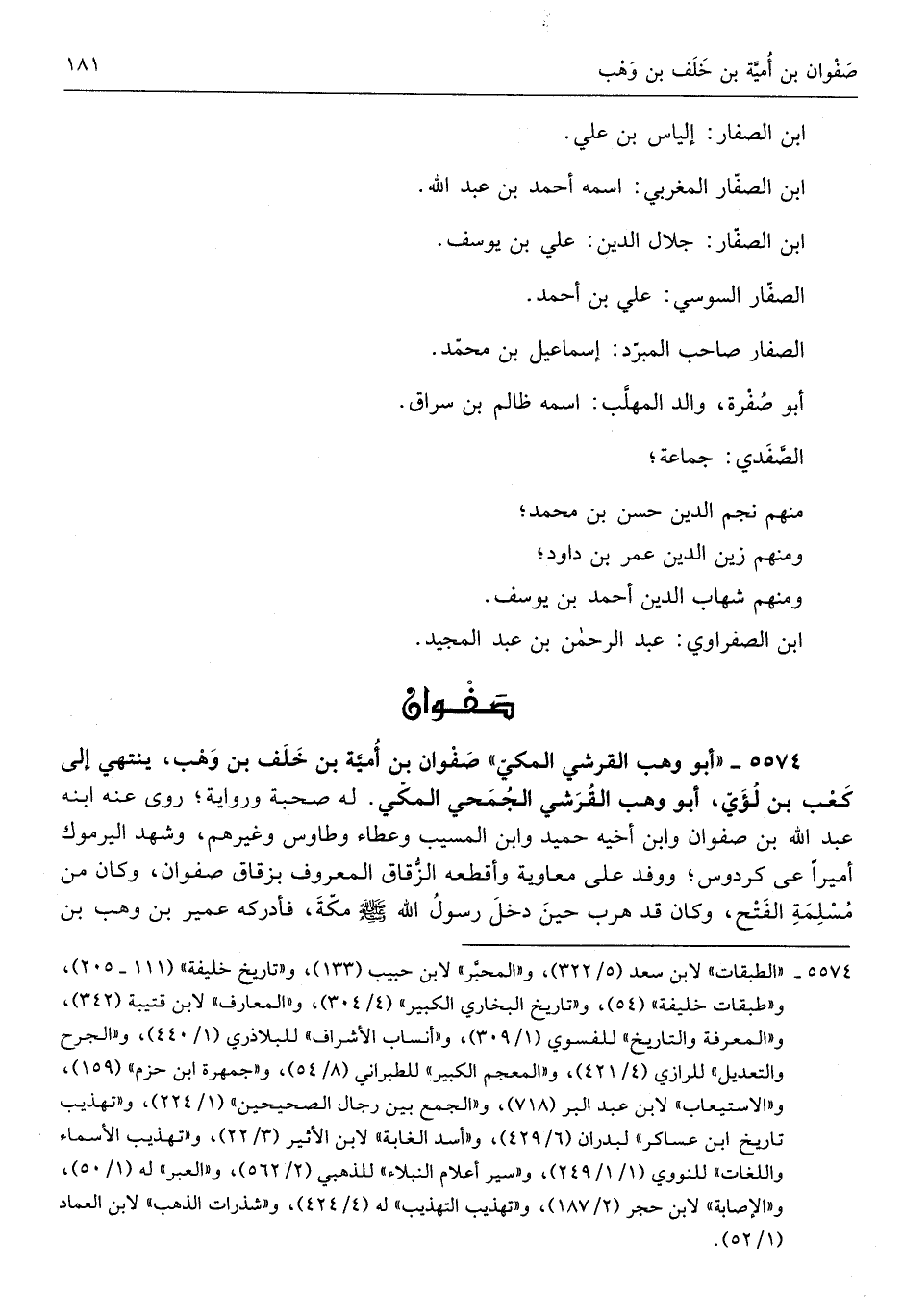 صَفْوَان بن أُميَّة بن خلف بن وهب يَنْتَهِي إِلَى كَعْب بن لوي أَبُو وهب الْقرشِي الجُمَحِي الْمَكِّيّ روى عَنهُ ابْنه عبد الله بن صَفْوَان وَابْن أَخِيه حميد وَابْن الْمسيب وَعَطَاء وَطَاوُس وَغَيرهم وَشهد اليرموك أَمِيرا على كرْدُوس ووفد على مُعَاوِيَة وأقطعه الزقاق الْمَعْرُوف بزقاق صَفْوَان وَكَانَ من مسلمة الْفَتْح وَكَانَ قد هرب حِين دخل رَسُول الله صلى الله عَلَيْهِ وَسلم مَكَّة فأدركه عُمَيْر بن وهب بن