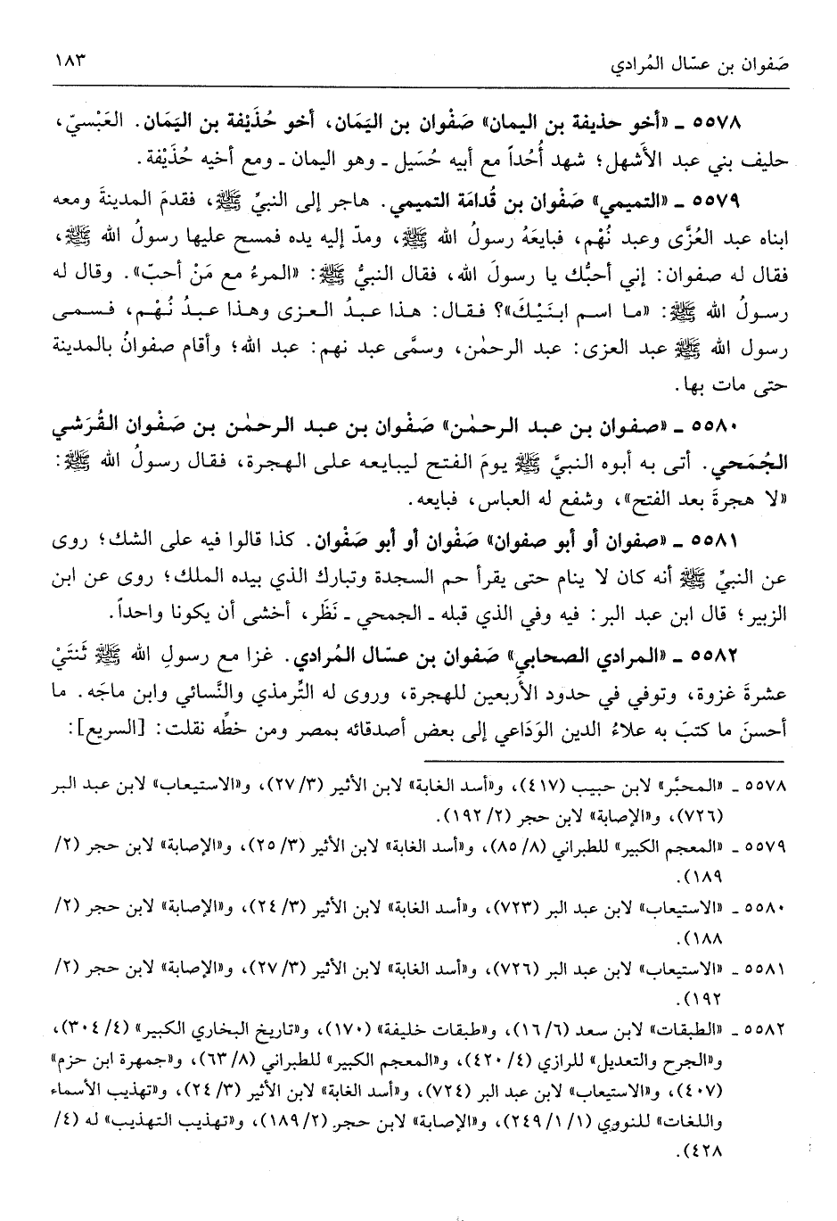 صَفْوَان بن عَسَّال الْمرَادِي غزا مَعَ رَسُول الله صلى الله عَلَيْهِ وَسلم اثْنَتَيْ عشرَة غَزْوَة وَتُوفِّي فِي حُدُود الْأَرْبَعين لِلْهِجْرَةِ وروى لَهُ التِّرْمِذِيّ وَالنَّسَائِيّ وَابْن ماجة مَا أحسن مَا كتب بِهِ عَلَاء الدّين الوداعي إِلَى بعض أصدقائه بِمصْر وَمن خطه نقلت