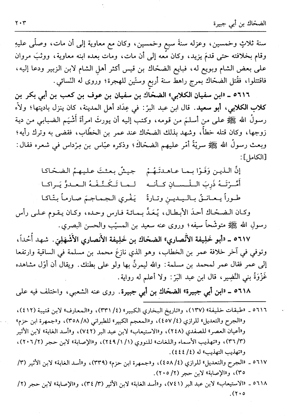 الضَّحَّاك بن سُفْيَان بن عَوْف بن كَعْب بن أبي بكر بن كلاب الْكلابِي أَبُو سعيد قَالَ ابْن عبد الْبر فِي عداد أهل الْمَدِينَة كَانَ ينزل باديتها ولاه رَسُول الله صلى الله عَلَيْهِ وَسلم على من أسلم من قومه وَكتب إِلَيْهِ أَن يُورث امْرَأَة أَشْيَم الضبابِي من دِيَة زَوجهَا وَكَانَ قَتله خطأ وَشهد بذلك الضَّحَّاك عِنْد عمر بن الْخطاب فَقضى بِهِ وَترك رَأْيه وَبعث رَسُول الله صلى الله عَلَيْهِ وَسلم سَرِيَّة أَمر عَلَيْهِم الضَّحَّاك وَذكره عَبَّاس بن مرداس فِي شعره فَقَالَ
