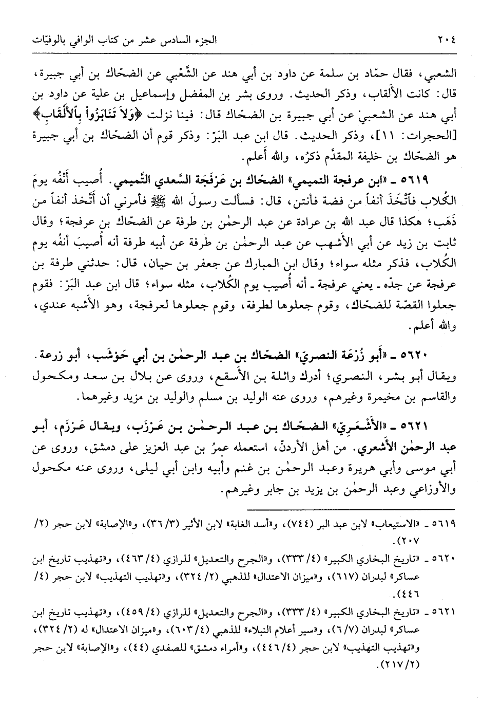 الضَّحَّاك بن عرْفجَة السَّعْدِيّ التَّمِيمِي أُصِيب أَنفه يَوْم الْكلاب فَاتخذ أنفًا من فضَّة فَأَنْتن قَالَ فَسَأَلت رَسُول الله صلى الله عَلَيْهِ وَسلم فَأمرنِي أَن اتخذ أنفًا من ذهب هَكَذَا قَالَ عبد الله بن عَرَادَة عَن عبد الرَّحْمَن بن طرفَة عَن الضَّحَّاك بن عرْفجَة وَقَالَ ثَابت بن زيد عَن أبي الْأَشْهب عَن عبد الرَّحْمَن ابْن طرفَة عَن أَبِيه طرفَة أَنه أُصِيب أَنفه يَوْم الْكلاب فَذكر مثله سَوَاء وَقَالَ ابْن الْمُبَارك عَن جَعْفَر بن حَيَّان قَالَ حَدثنِي طرفَة بن عرْفجَة عَن جده يَعْنِي عرْفجَة أَنه أُصِيب أَنفه يَوْم الْكلاب مثله سَوَاء قَالَ ابْن عبد البرك فقوم جعلُوا الْقِصَّة للضحاك وَقوم جعلوها لطرفة وَقوم جعلوها لعرفجة وَهُوَ الْأَشْبَه عِنْدِي وَالله أعلم