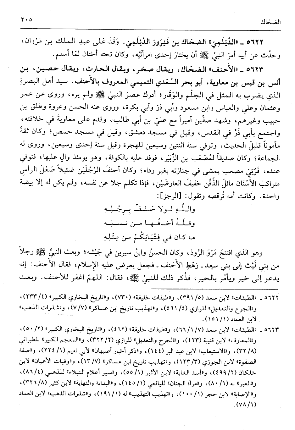 الضَّحَّاك وَيُقَال صَخْر وَيُقَال الْحَارِث وَيُقَال حُصَيْن بن أنس ابْن قيس بن مُعَاوِيَة أَبُو بَحر السَّعْدِيّ الْمَعْرُوف بالأحنف سيد أهل الْبَصْرَة الَّذِي يضْرب بِهِ الْمثل فِي الْحلم وَالْوَقار أدْرك عصر النَّبِي صلى الله عَلَيْهِ وَسلم وَلم يره وروى عَن عمر وَعُثْمَان وَعلي وَالْعَبَّاس وَابْن مَسْعُود وَأبي ذَر وَأبي بكرَة وروى عَنهُ الْحسن وَعُرْوَة وطلق بن حبيب وَغَيرهم وَشهد صفّين أَمِيرا مَعَ عَليّ بن أبي طَالب وَقدم على مُعَاوِيَة فِي خِلَافَته وَاجْتمعَ بِأبي ذَر فِي الْقُدس وَقيل فِي مَسْجِد دمشق وَقيل فِي مَسْجِد حمص وَكَانَ ثِقَة مَأْمُونا قَلِيل الحَدِيث وَتُوفِّي سنة اثْنَتَيْنِ وَسبعين لِلْهِجْرَةِ وَقيل سنة إِحْدَى وَسبعين وروى لَهُ الْجِمَاع وَكَانَ صديقا لمصعب بن الزبير فوفد عَلَيْهِ بِالْكُوفَةِ وَهُوَ يَوْمئِذٍ وَال عَلَيْهَا فَتوفي عِنْده فَرُئِيَ مُصعب يمشي فِي جنَازَته بِغَيْر رِدَاء وَكَانَ أحنف الرجلَيْن ضئيلاً صعل الرَّأْس متراكب الْأَسْنَان مائل الذقن خَفِيف العارضين فَإِذا تكلم جلا عَن نَفسه وَلم يكن لَهُ إِلَّا بَيْضَة وَاحِدَة وَكَانَت أمه ترقصه وَتقول وَالله لَوْلَا حنف بِرجلِهِ وَقلة أخافها من نَسْله مَا كَانَ فِي فتيانكم من مثله وَهُوَ الَّذِي افْتتح مرو الروذ وَكَانَ الْحسن وَابْن سِيرِين فِي جَيْشه وَبعث النَّبِي صلى الله عَلَيْهِ وَسلم رجلا من بني لَيْث إِلَى بني سعد رَهْط الْأَحْنَف فَجعل يعرض عَلَيْهِ الْإِسْلَام فَقَالَ الْأَحْنَف إِنَّه يَدْعُو إِلَى خير وَيَأْمُر بِالْخَيرِ فَذكر ذَلِك للنَّبِي صلى الله عَلَيْهِ وَسلم فَقَالَ اللَّهُمَّ اغْفِر للأحنف وَبعث