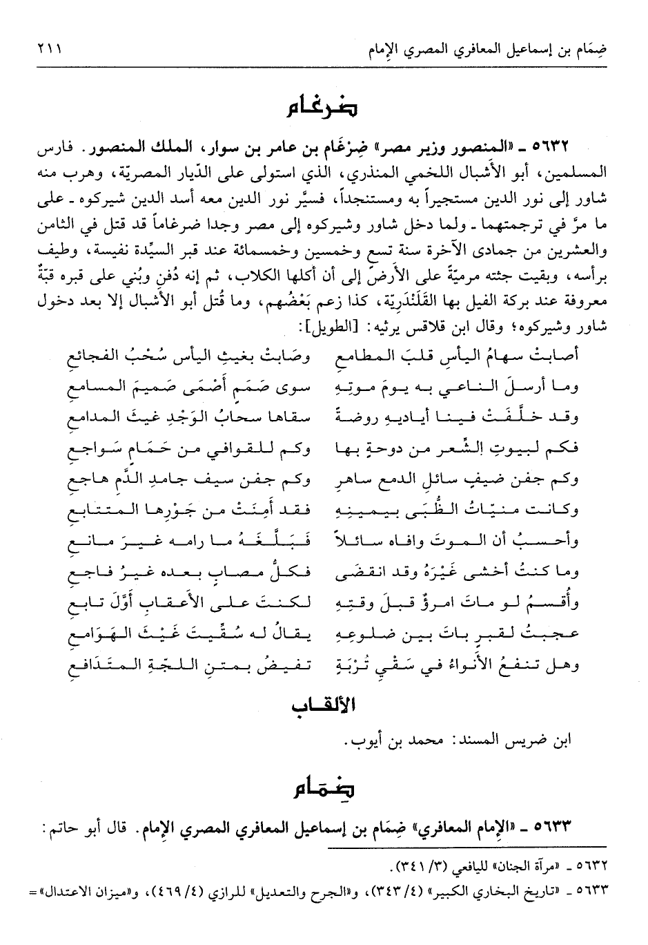 ضرغام بن عَامر بن سوار الْملك الْمَنْصُور فَارس الْمُسلمين أَبُو الأشبال اللَّخْمِيّ الْمُنْذِرِيّ الَّذِي استولى على الديار المصرية وهرب مِنْهُ شاور إِلَى نور الدّين مستجيراً بِهِ ومستنجداً فسير نور الدّين مَعَه أَسد الدّين شيركوه على مَا مر فِي ترجمتهما وَلما دخل شاور وشيركوه إِلَى مصر وجدا ضرغاماً قد قتل فِي الثَّامِن وَالْعِشْرين من جُمَادَى الْآخِرَة سنة تسع وَخمسين وَخَمْسمِائة عِنْد قبر السيدة نفيسة وطيف بِرَأْسِهِ وَبقيت جثته مرمية على الأَرْض إِلَى أَن أكلهَا الْكلاب ثمَّ إِنَّه دفن وَبني على قَبره قبَّة مَعْرُوفَة عِنْد بركَة الْفِيل بهَا القلندرية كَذَا زعم بَعضهم وَمَا قتل أَبُو الأشبال إِلَّا بعد دُخُول شاور وشيركوه وَقَالَ ابْن قلاقس يرثيه
