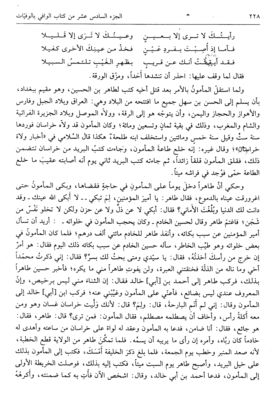 وَحكي أَن طَاهِرا دخل يَوْمًا على الْمَأْمُون فِي حَاجَة فقضاها وَبكى الْمَأْمُون حَتَّى اغرورقت عَيناهُ بالدموع فَقَالَ طَاهِر يَا أَمِير الْمُؤمنِينَ لم تبْكي لَا أبكى الله عَيْنك وَقد دَانَتْ لَك الدُّنْيَا وَبَلغت الْأَمَانِي فَقَالَ أبْكِي لَا عَن ذل وَلَا عَن حزن وَلَكِن لَا تَخْلُو نفس من شجن فَاغْتَمَّ طَاهِر وَقَالَ لحسين الْخَادِم وَكَانَ يحجب الْمَأْمُون فِي خلواته أُرِيد أَن تسْأَل أَمِير الْمُؤمنِينَ عَن سَبَب بكائه وانفذ طَاهِر للخادم مِائَتي ألف دِرْهَم فَلَمَّا كَانَ الْمَأْمُون فِي بعض خلواته وَهُوَ طيب الخاطر سَأَلَهُ حُسَيْن الْخَادِم عَن سَبَب بكائه ذَلِك الْيَوْم فَقَالَ هُوَ أَمر إِن خرج من رَأسك أَخَذته فَقَالَ يَا سَيِّدي وَمَتى بحت لَك بسر فَقَالَ إِنِّي ذكرت مُحَمَّدًا أخي وَمَا ناله من الذلة فخنقتني الْعبْرَة وَلنْ يفوت طَاهِرا مني مَا يكره فاخبر حُسَيْن طَاهِرا بذلك فَركب طَاهِر إِلَى أَحْمد بن آبي خَالِد فَقَالَ إِن الثَّنَاء مني لَيْسَ برخيص وَإِن الْمَعْرُوف عِنْدِي لَيْسَ بضائع فأعني على الْمَأْمُون وغيبني عَنهُ فَركب ابْن أبي خَالِد إِلَى الْمَأْمُون وَقَالَ إِنِّي لم أنم البارحة قَالَ وَلم قَالَ لِأَنَّك وليت خُرَاسَان غَسَّان وَهُوَ وَمن مَعَه أَكلَة رَأس وأخاف أَن يصطلمه مصطلم فَقَالَ الْمَأْمُون فَمن ترى قَالَ طَاهِر فَقَالَ هُوَ جَائِع فَقَالَ أَنا ضَامِن فَدَعَا بِهِ الْمَأْمُون وَعقد لَهُ لِوَاء على خُرَاسَان من سَاعَته وَأهْدى لَهُ خَادِمًا كَانَ رباه وَأمره إِن رأى مِنْهُ مَا يرِيبهُ أَن يسمه فَلَمَّا تمكن طَاهِر من الْولَايَة قطع الْخطْبَة لِأَنَّهُ صعد الْمِنْبَر وخطب يَوْم الْجُمُعَة فَلَمَّا بلغ ذكر الْخَلِيفَة أمسك فَكتب إِلَى الْمَأْمُون بذلك على خيل الْبَرِيد وَأصْبح طَاهِر يَوْم السبت مَيتا فَكتب إِلَيْهِ بذلك فوصلت الخريطة الأولى إِلَى الْمَأْمُون فَدَعَا أَحْمد بن أبي خَالِد وَقَالَ اشخص الْآن فأت بِهِ كَمَا ضمنته وأكرهه